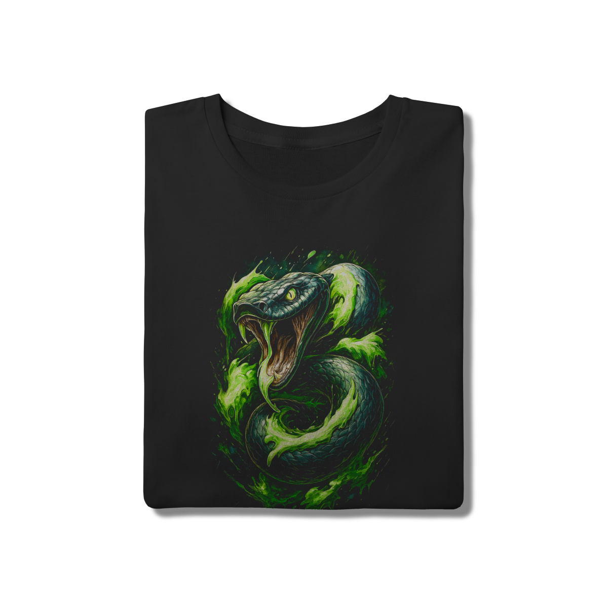 Domine as sombras com a energia tóxica da Acid Viper. Esta estampa apresenta uma serpente agressiva envolta em chamas verdes neon e fluidos radioativos. Uma peça de alto impacto visual que une a natureza selvagem com uma paleta de cores vibrante e moderna.