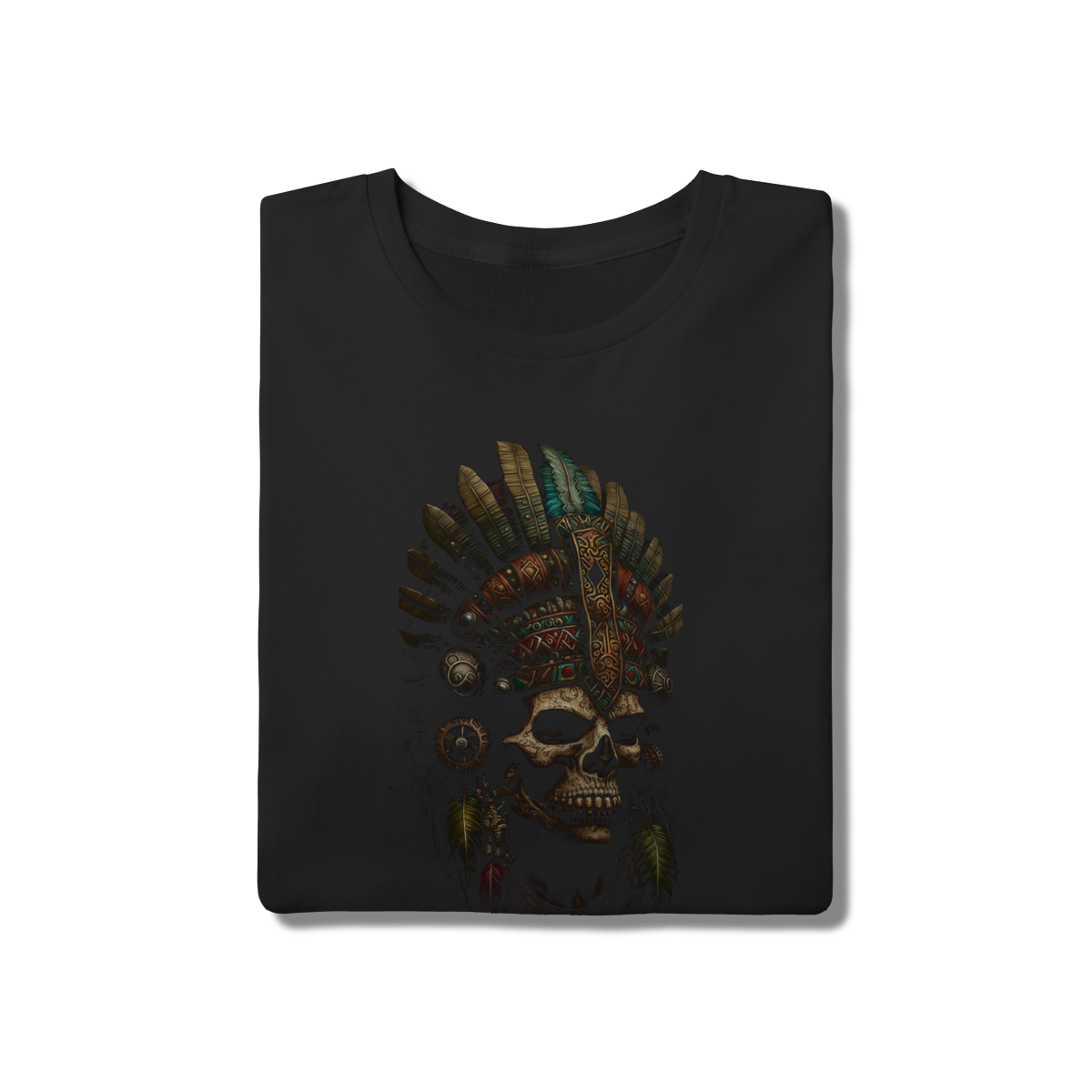 • Explore as raízes das grandes civilizações. Esta estampa apresenta uma caveira com um majestoso cocar ornamental em tons de ocre, verde e terra, remetendo à arte asteca e maia. O acabamento envelhecido da arte confere um ar de relíquia à peça. Perfeita para amantes de história e design étnico. Conforto garantido pela malha 100% algodão de alta qualidade.