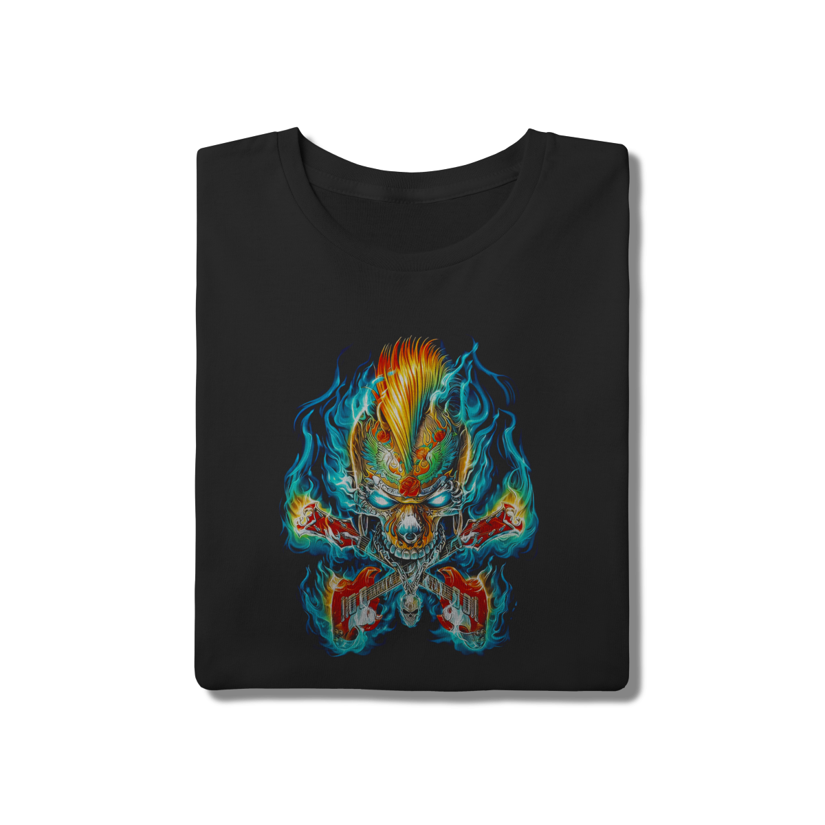 • Sinta a energia do palco. Esta estampa explosiva combina uma caveira de moicano com guitarras cruzadas, tudo envolto em chamas azuis e neon vibrantes. Uma arte psicodélica e cheia de movimento que se destaca em qualquer ambiente. Modelagem clássica com gola reforçada, ideal para aguentar o mosh pit ou para destacar seu estilo rocker no dia a dia.