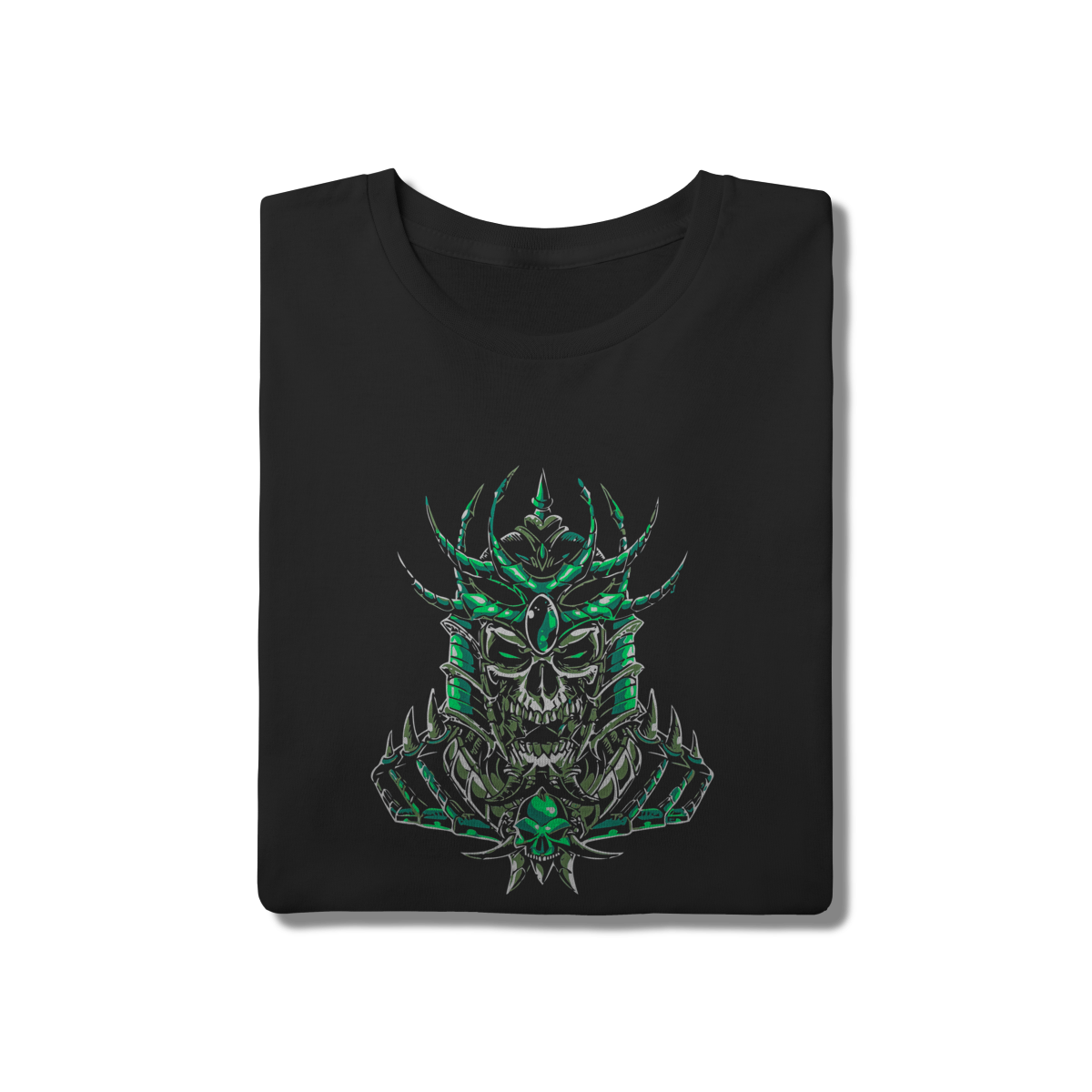 • Design agressivo e futurista. Esta caveira ostenta uma armadura detalhada em tons de verde esmeralda e cromo, lembrando chefões de jogos de RPG épicos. Uma estampa de alta definição para quem busca um visual "armored" e impactante. Modelagem tradicional em algodão premium que não encolhe e mantém a cor vibrante por muito mais tempo.