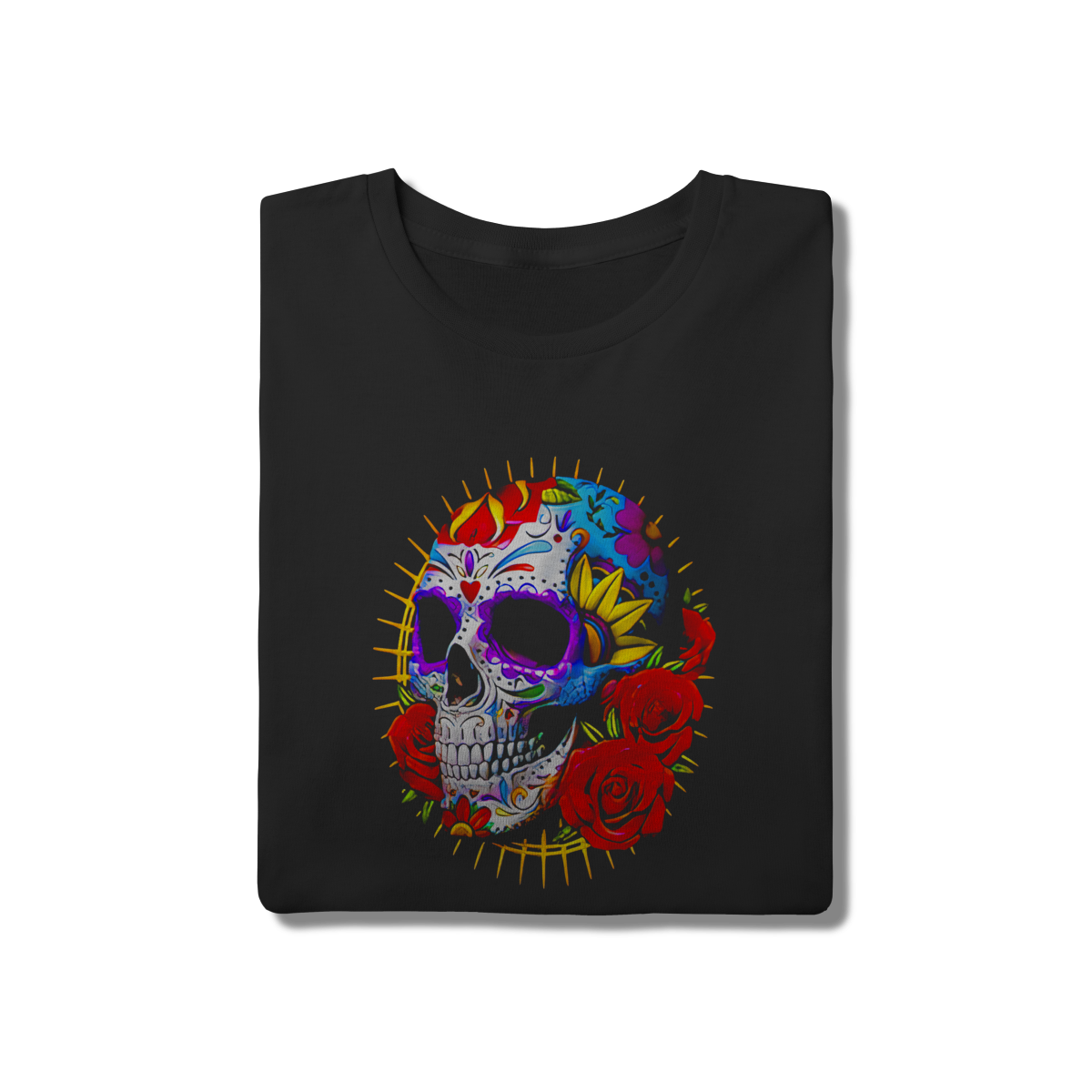 • Celebre a vida com cores vibrantes. Nossa interpretação da tradicional caveira mexicana traz flores, ornamentos e um degradê psicodélico que se destaca no fundo preto. Uma peça de streetwear artístico para quem gosta de estampas detalhadas e cheias de significado. Tecido macio em algodão premium que garante frescor e caimento impecável.