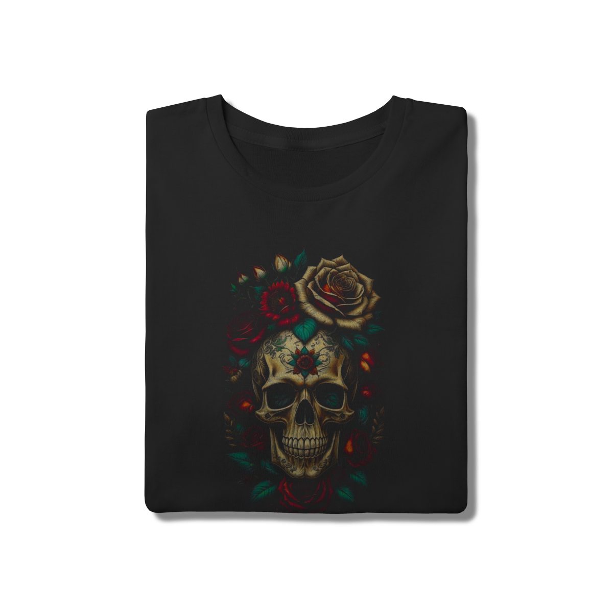 • Elegância e mistério em uma estampa clássica. Esta peça apresenta uma caveira detalhada em estilo "vintage" cercada por rosas vermelhas e beges. Perfeita para quem aprecia a estética da cultura mexicana e o simbolismo da Santa Muerte. O contraste dos tons terrosos no preto da camiseta cria um visual sofisticado e atemporal. Conforto garantido pela malha de algodão premium.