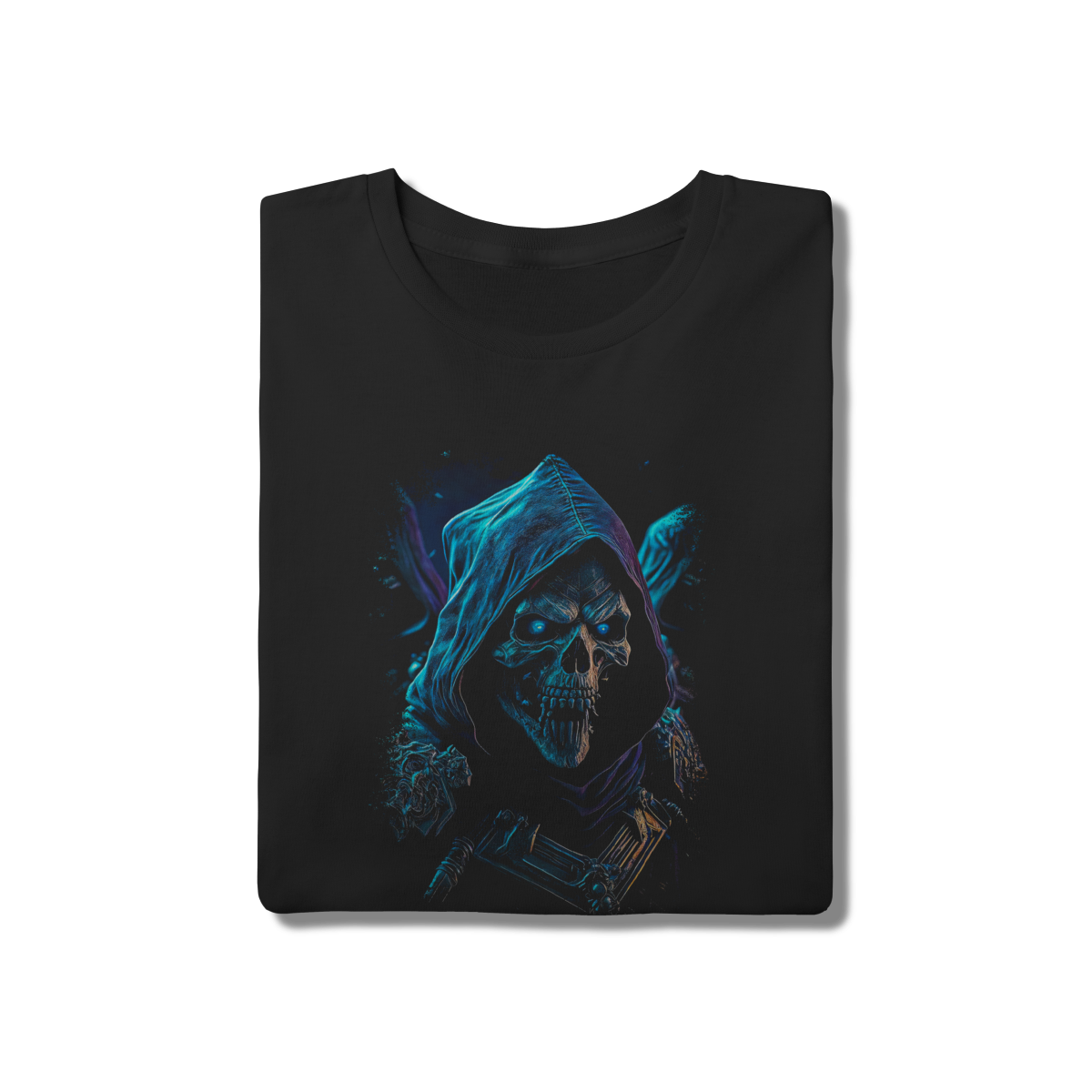 • Entre no reino da fantasia sombria. Esta estampa traz um esqueleto encapuzado com olhos brilhantes em azul neon, criando um efeito visual profundo e hipnotizante. Perfeita para gamers, jogadores de RPG e fãs de universos épicos. A malha preta de algodão realça o contraste azul, garantindo uma peça que se destaca na multidão com muito conforto.