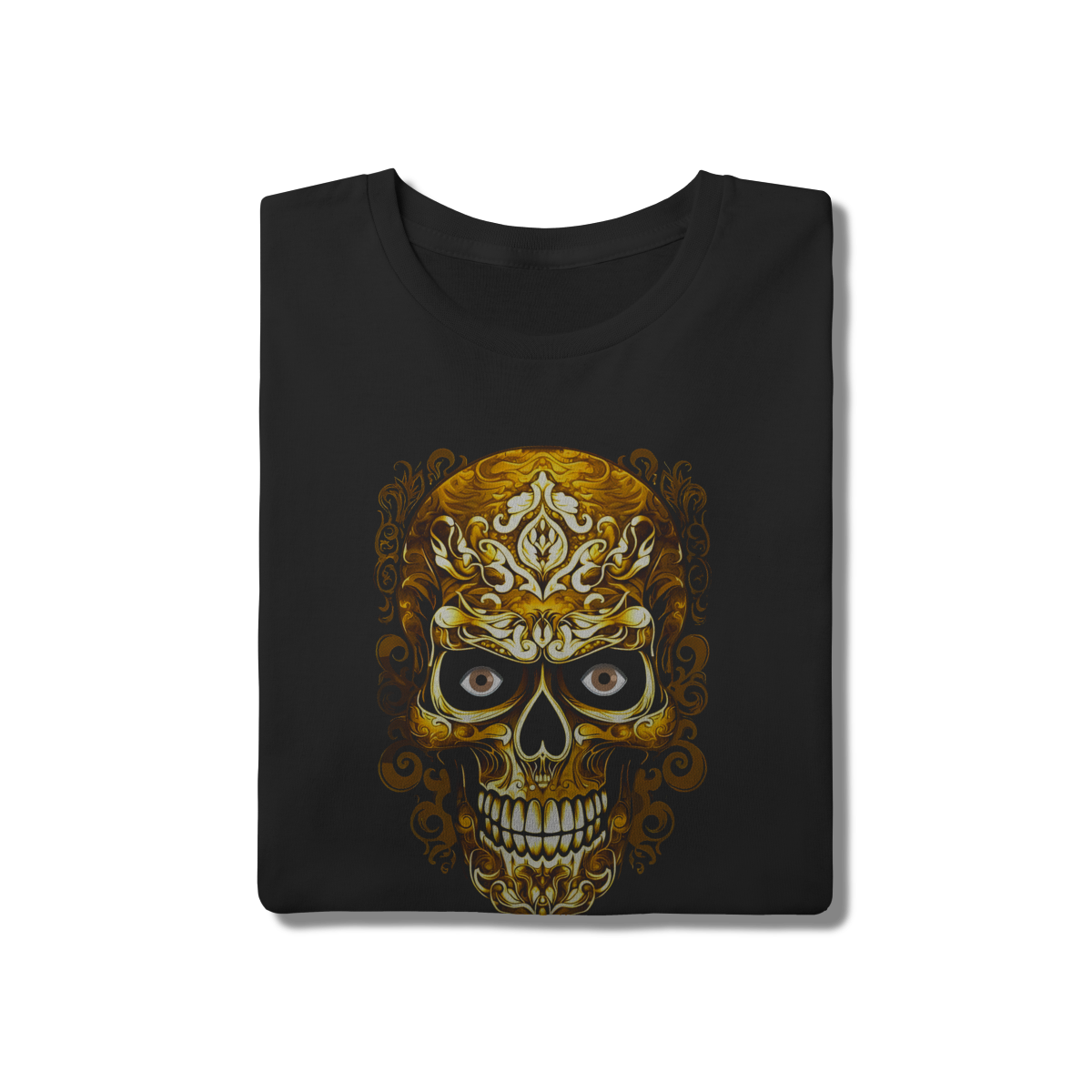 • Sofisticação e mistério em uma única peça. Esta estampa apresenta uma caveira rica em detalhes ornamentais dourados e arabescos, criando um visual luxuoso e artístico. O contraste do dourado com o preto do algodão confere uma presença marcante. Perfeita para quem busca uma camiseta de caveira com um toque de exclusividade e design refinado.