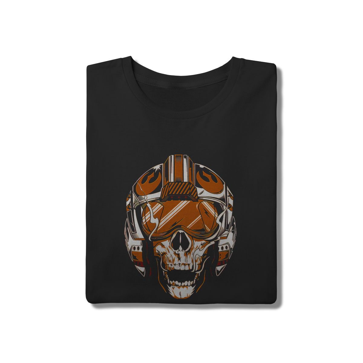 Una a rebeldia do estilo Skull com a paixão pela ficção científica. Esta camiseta traz uma caveira estilizada com capacete de piloto espacial em tons de laranja e branco, criando um contraste vibrante no tecido preto. Feita em algodão de alta gramatura com modelagem tradicional, é a peça perfeita para o fã de sci-fi que busca um visual autêntico e underground.
