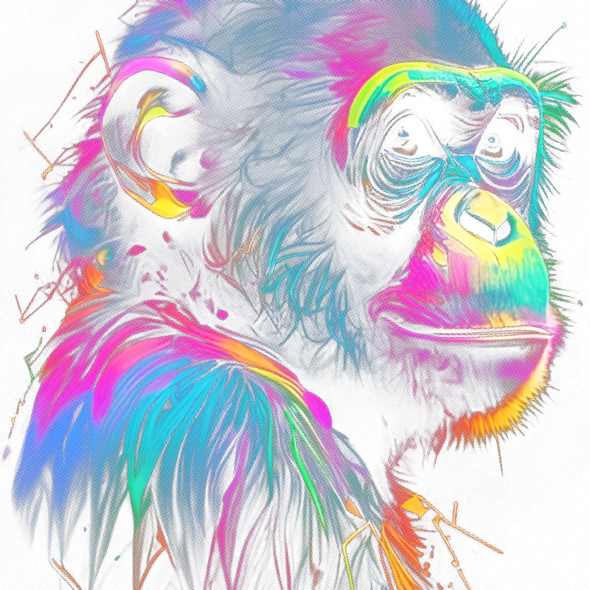 Uma verdadeira explosão cromática no seu guarda-roupa. Esta camiseta traz o perfil de um chimpanzé em linhas neon multicoloridas que criam um efeito visual dinâmico e moderno. Feita para quem não tem medo de ousar e valoriza a arte contemporânea.