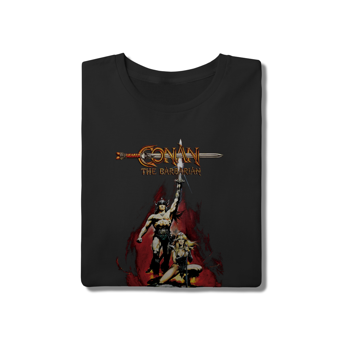 Domine o seu destino com a Camiseta Conan o Bárbaro. Esta estampa traz a arte icônica do clássico de 1982, destacando Arnold Schwarzenegger em sua pose lendária. Fabricada em algodão 100%, na cor preta e com modelagem tradicional unissex, ela oferece o máximo conforto e durabilidade. Ideal para fãs de fantasia épica e do cinema de ação old school.