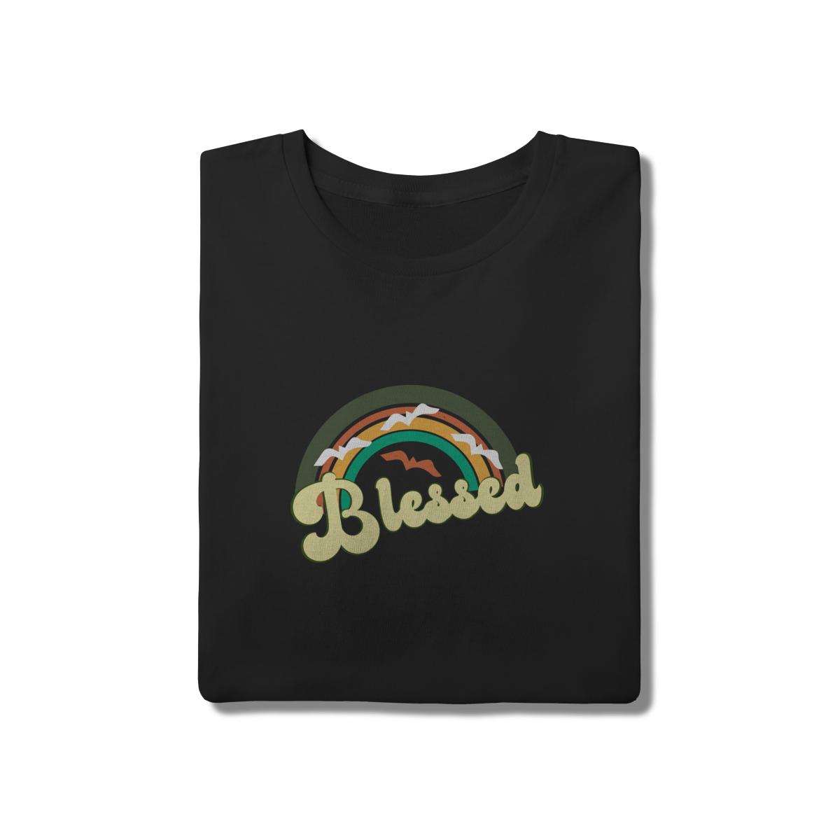 • Expresse sua gratidão com estilo! Nossa camiseta "Blessed" traz um design vintage com arco-íris em tons terrosos e pássaros, simbolizando a paz e a providência divina. Feita em malha premium de algodão preto, oferece o toque macio e a durabilidade que você busca no dia a dia. Modelagem tradicional unissex que veste bem em qualquer ocasião.