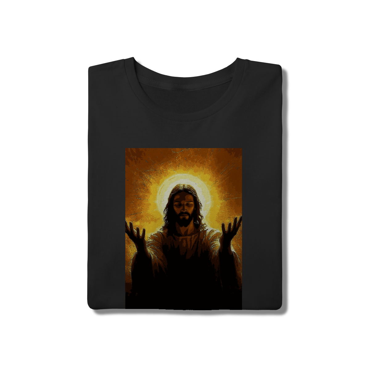 Leve consigo o símbolo da esperança e da luz divina. Esta estampa exclusiva retrata Jesus em um momento de oração e glória, envolto em um halo dourado que irradia paz. O contraste do dourado vibrante com o tecido preto profundo cria uma peça sofisticada e cheia de significado.