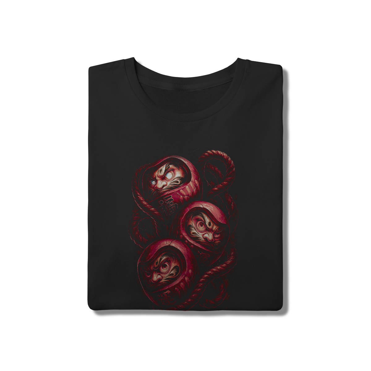 Triplique sua sorte com esta versão estilizada e levemente agressiva do clássico amuleto Daruma. Unidos por cordas tradicionais, estes três bonecos representam o foco e a conquista de objetivos. Uma arte urbana que mistura cultura tradicional com um toque underground.
