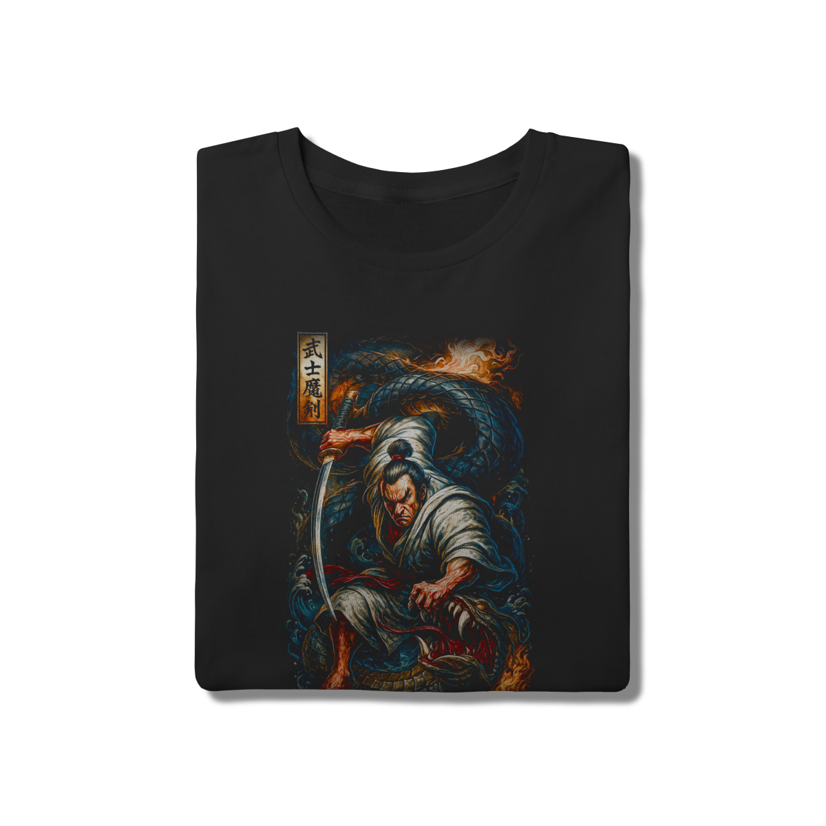 A batalha épica entre o homem e a fera imortalizada em uma estampa exclusiva. Esta arte detalha um samurai em posição de ataque contra uma serpente colossal, inspirada nas lendas clássicas do Japão. Uma peça com alto nível de detalhes e cores ricas, ideal para compor looks urbanos com personalidade. 100% algodão.