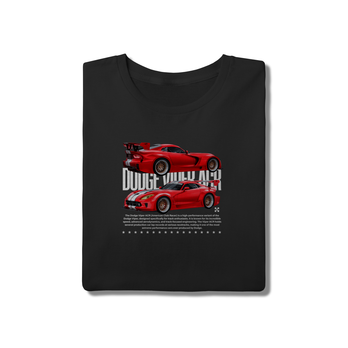 • Sinta o veneno do Dodge Viper ACR. Esta estampa destaca o design agressivo e a aerodinâmica extrema do recordista de Nürburgring. Uma camiseta feita para quem respeita a potência bruta americana e o legado do motor V10. Design focado em entusiastas de track days e superesportivos.
