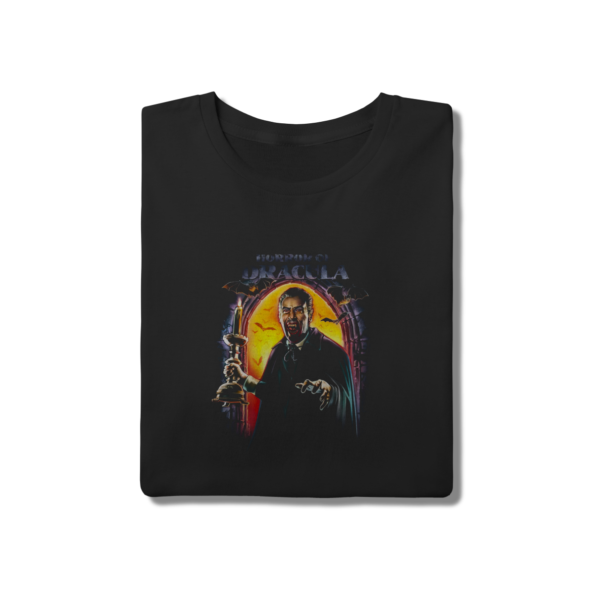 Traga o terror gótico para o seu estilo com a Camiseta Horror of Dracula. Apresentando o lendário Christopher Lee no papel que definiu o Conde Drácula para gerações, cercado por morcegos em uma atmosfera sombria. Nossa camiseta preta de modelagem tradicional é feita em puro algodão, garantindo frescor e resistência.