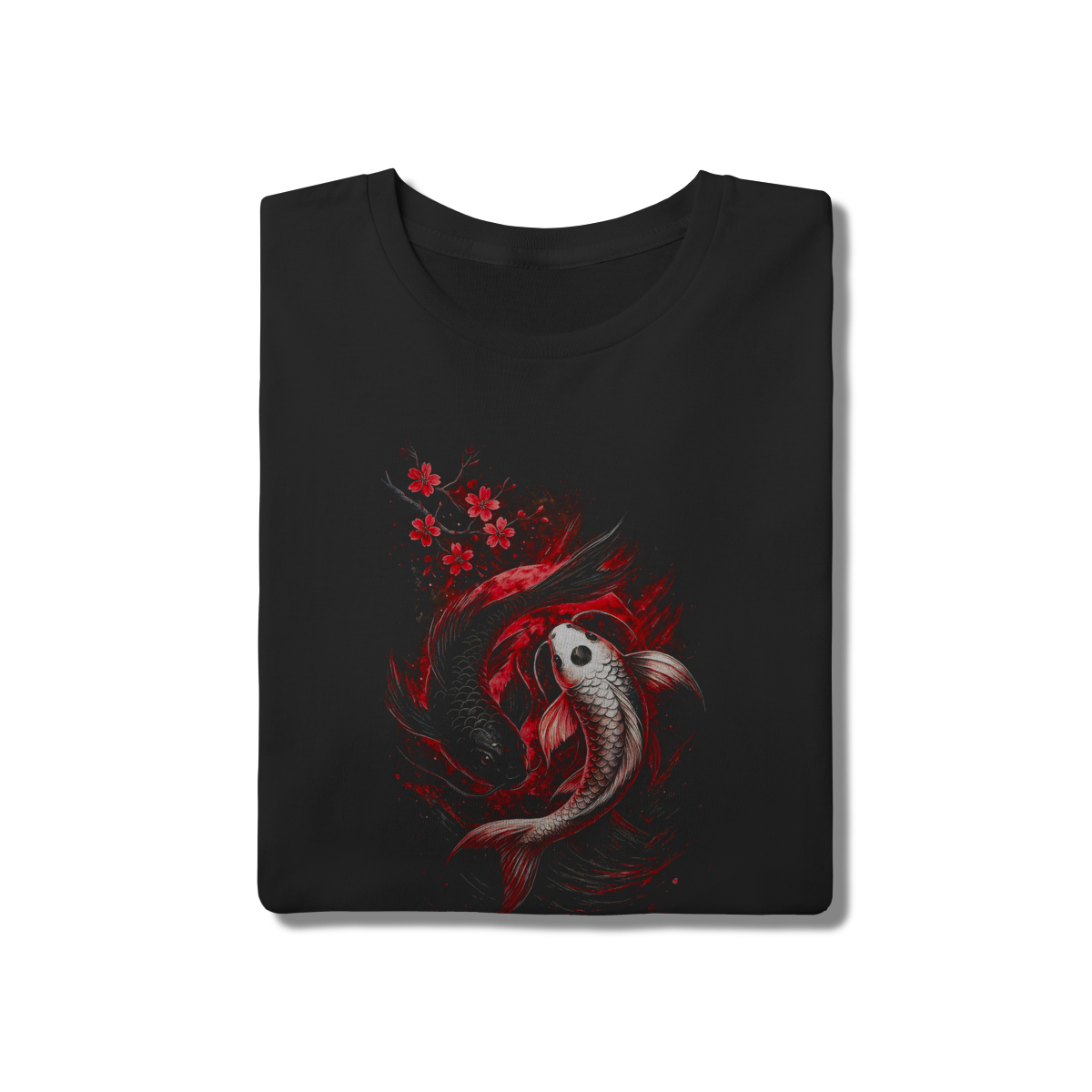 O equilíbrio perfeito entre luz e sombra. Esta estampa apresenta duas carpas Koi em movimento circular, formando o símbolo do Yin Yang sob delicadas flores de cerejeira (Sakura). Uma peça que transmite harmonia, paz e a beleza da fluidez oriental.