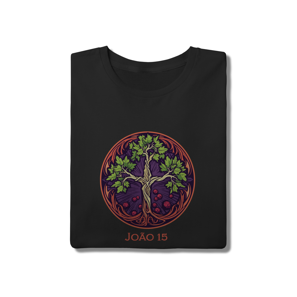 • Inspirada na parábola da videira, esta estampa traz uma árvore estilizada em formato de cruz com frutos e raízes profundas, simbolizando nossa conexão com Cristo. O design circular em tons de roxo, verde e laranja cria um visual orgânico e sofisticado. Uma peça indispensável para quem busca uma moda cristã com estética mística e fundamentada na palavra.