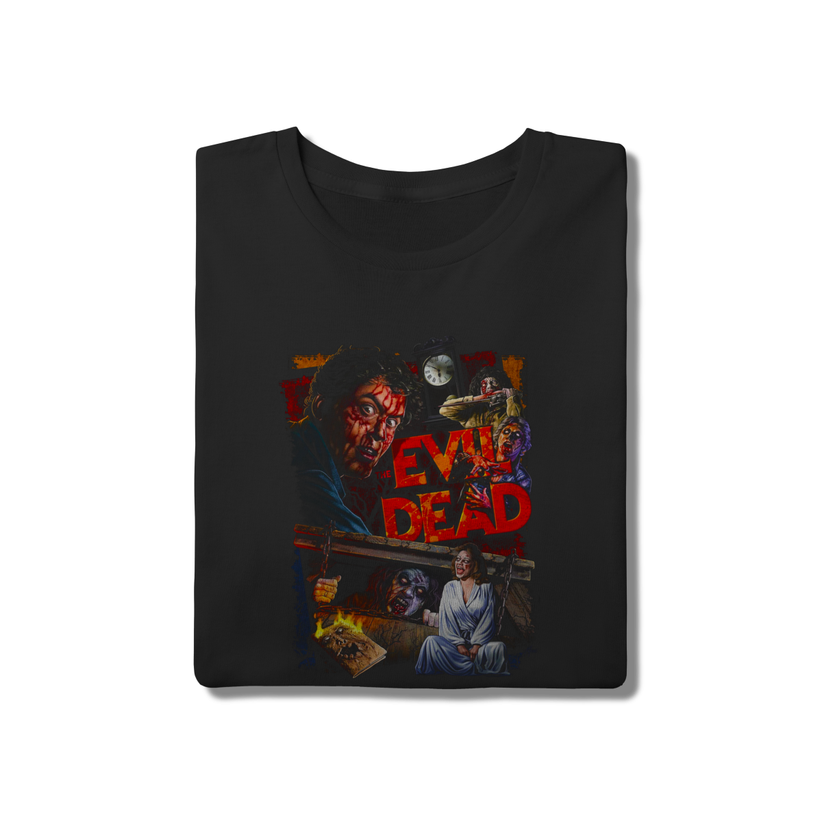 Para os verdadeiros amantes do "splatter", a Camiseta Evil Dead é um item obrigatório. A arte apresenta o clima caótico e sangrento do clássico de Sam Raimi, incluindo o icônico Necronomicon. Nossa camiseta preta de modelagem tradicional é resistente e confortável, perfeita para expressar sua paixão pelo horror visceral.