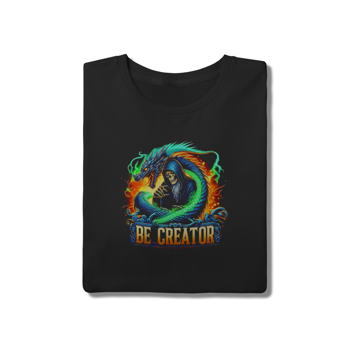 • Uma explosão de energia e fantasia épica. Esta camiseta traz a figura de um mago sombrio protegido por um dragão oriental envolto em raios neon. Com a frase "Be Creator", ela inspira poder e criatividade. Ideal para gamers, fãs de RPG e cultura geek que não abrem mão de um visual impactante. Modelagem tradicional com estampa de alta durabilidade.