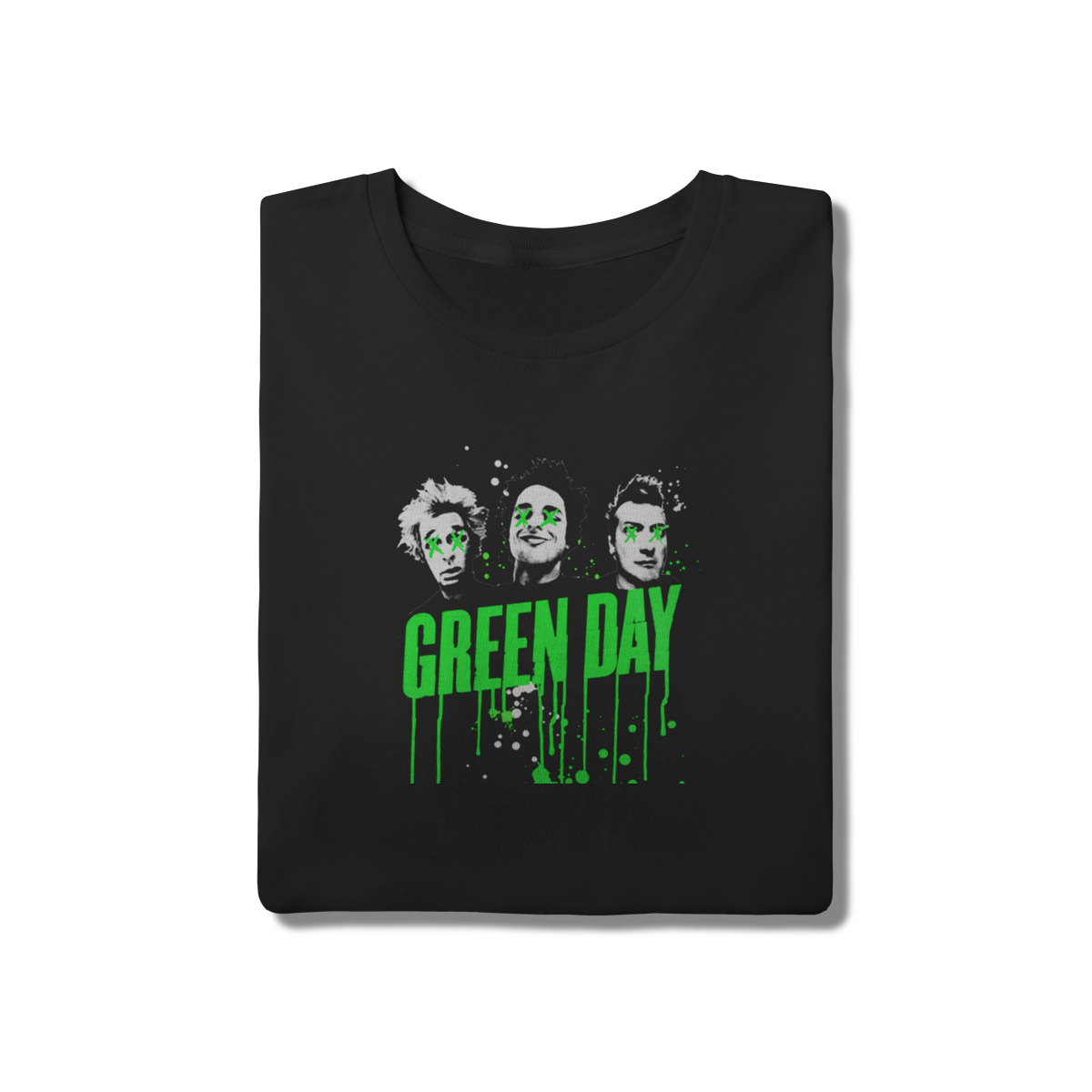 Atitude Punk em cada detalhe. Com uma estampa vibrante em verde neon destacando Billie Joe, Mike e Tré Cool, esta peça é indispensável para quem vive o espírito do Pop Punk dos anos 90 e 2000.