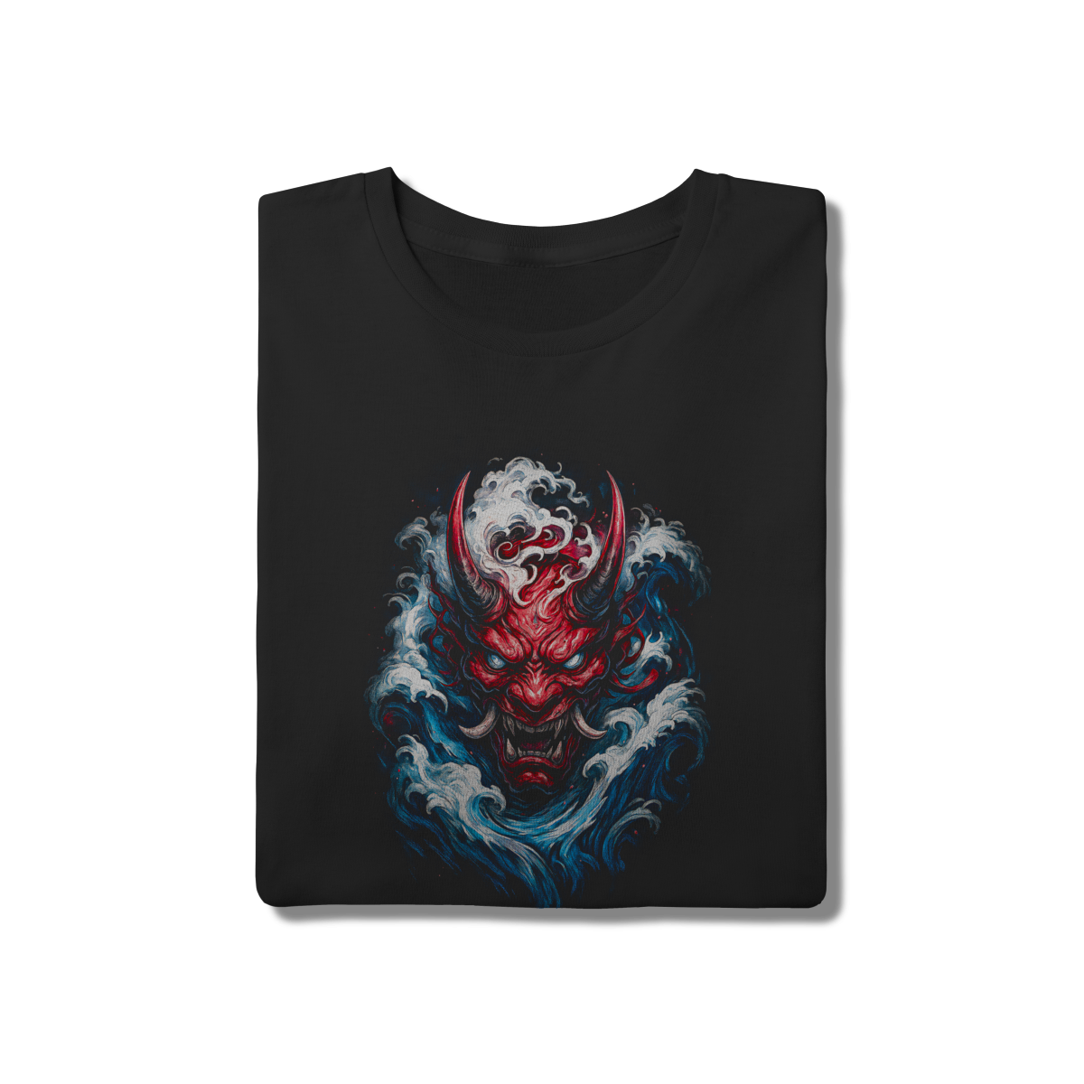 O poder do folclore japonês encontra a fúria do oceano. Esta estampa traz a máscara Hannya em vermelho profundo, cercada por ondas estilizadas que remetem à arte clássica de Kanagawa. Uma fusão perfeita entre o misticismo dos demônios japoneses e a estética marinha.