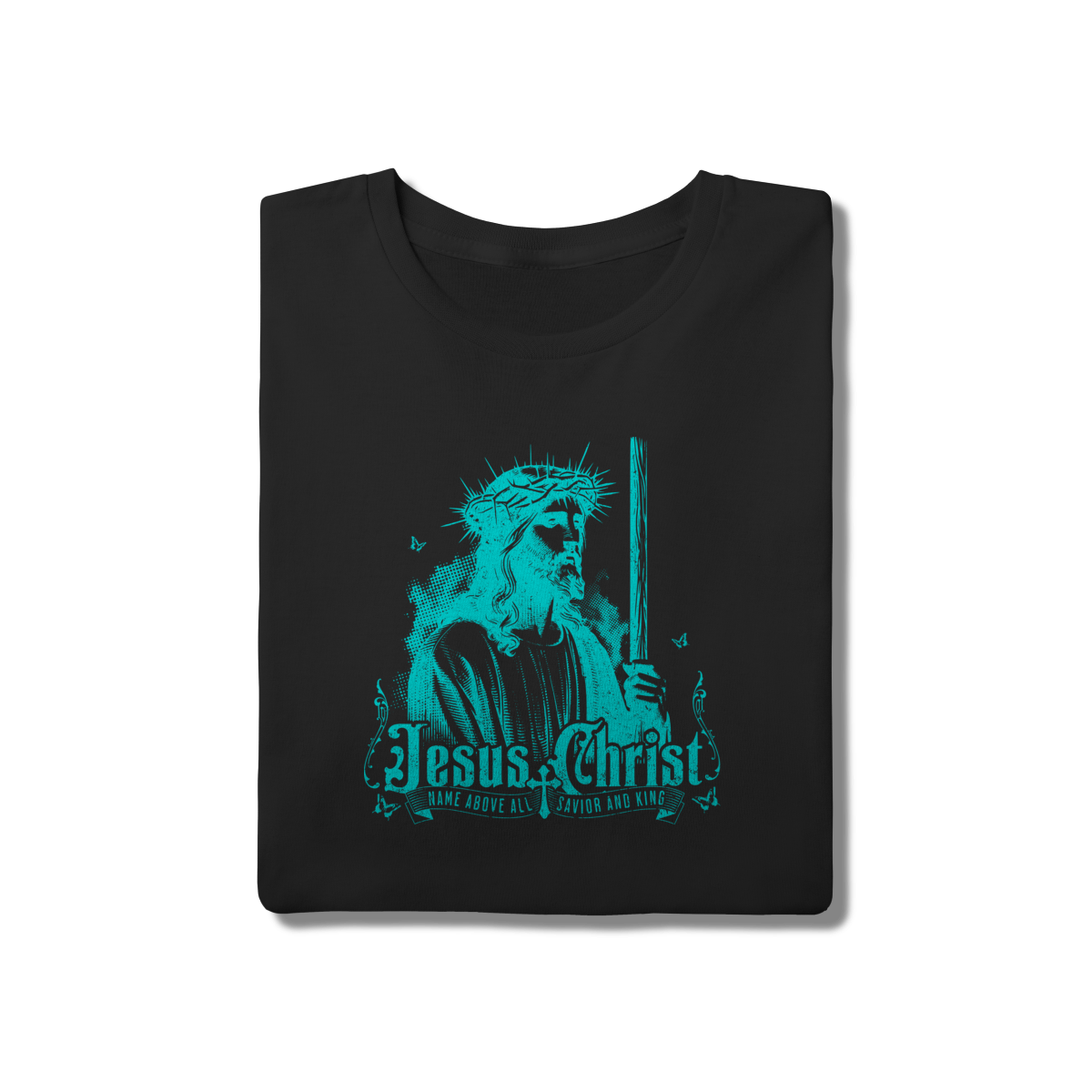 • Exalte o Nome que está acima de todo nome. Com uma estética que remete às gravuras antigas, mas em um tom azul vibrante, esta estampa traz a face de Jesus com a coroa de espinhos e os títulos "Salvador e Rei". Uma peça artística e moderna para o seu guarda-roupa cristão.