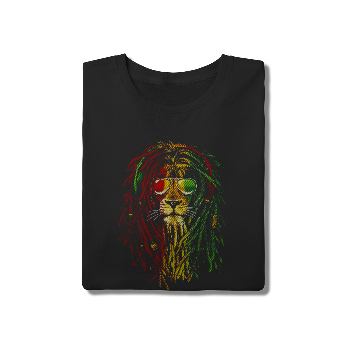 Sinta a vibe positiva com a nossa Camiseta Leão Reggae. O rei da selva ganha um visual descontraído com dreadlocks e óculos de sol nas cores icônicas do movimento rastafári (verde, amarelo e vermelho). Estilo streetwear autêntico para quem vive a música e a liberdade.