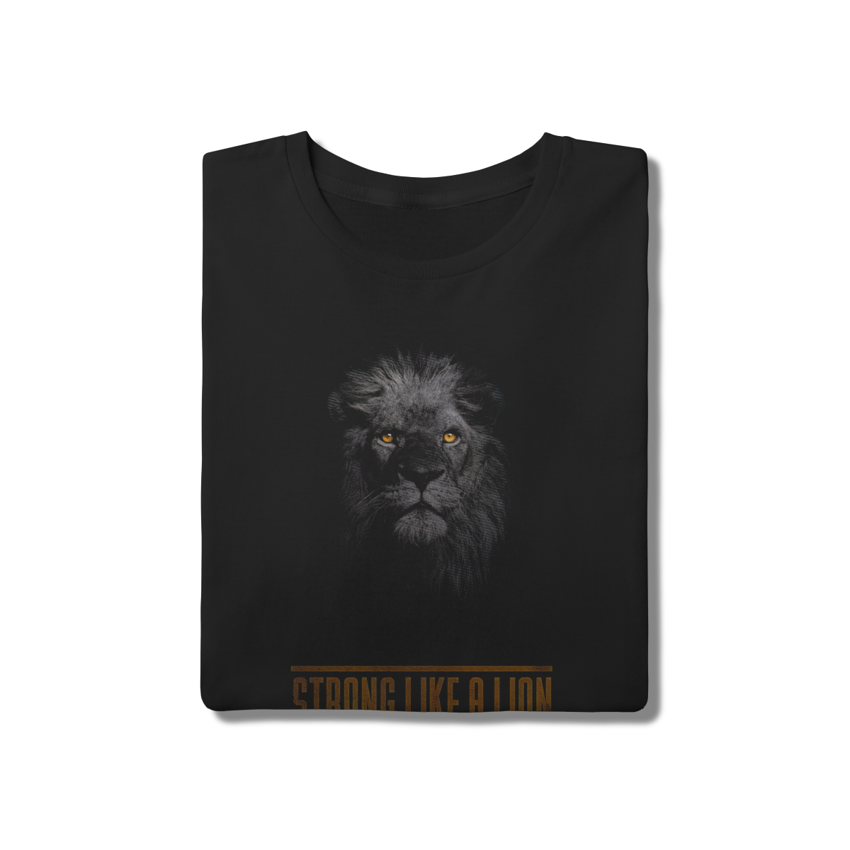 Para quem lidera com coragem. Esta camiseta traz a imponência do rei da selva em um design sóbrio com olhos destacados em dourado. A frase "Strong Like a Lion" reforça a identidade de quem sabe o que quer. Essencial para um guarda-roupa versátil.