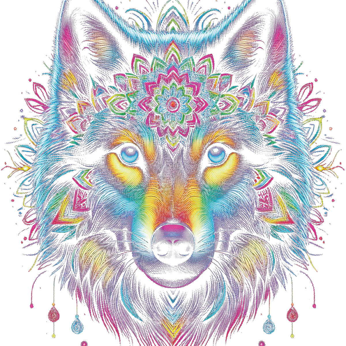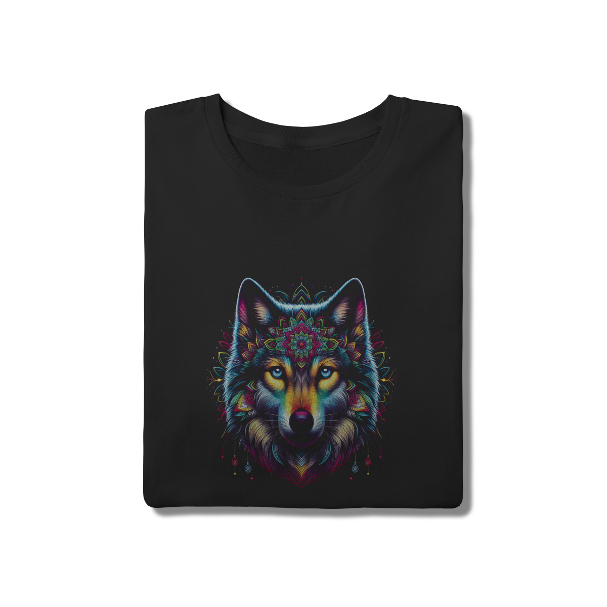 Equilíbrio e foco traduzidos em arte. Esta camiseta traz o lobo místico coroado por uma mandala detalhada em tons vibrantes de rosa, azul e dourado. Uma peça com estética Boho Chic, ideal para compor looks modernos e cheios de energia positiva.