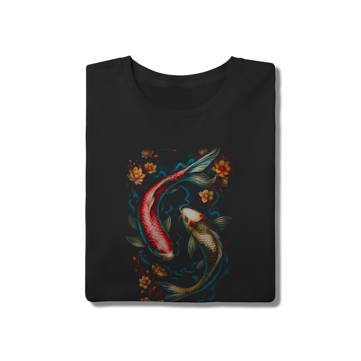 Sinta a harmonia das Carpas Koi nesta estampa que simboliza superação e fluidez. Com cores intensas e detalhes florais em um fundo dark, esta camiseta é uma obra de arte em movimento. Feita em algodão de alta qualidade, une o simbolismo tradicional japonês à sofisticação do design contemporâneo.