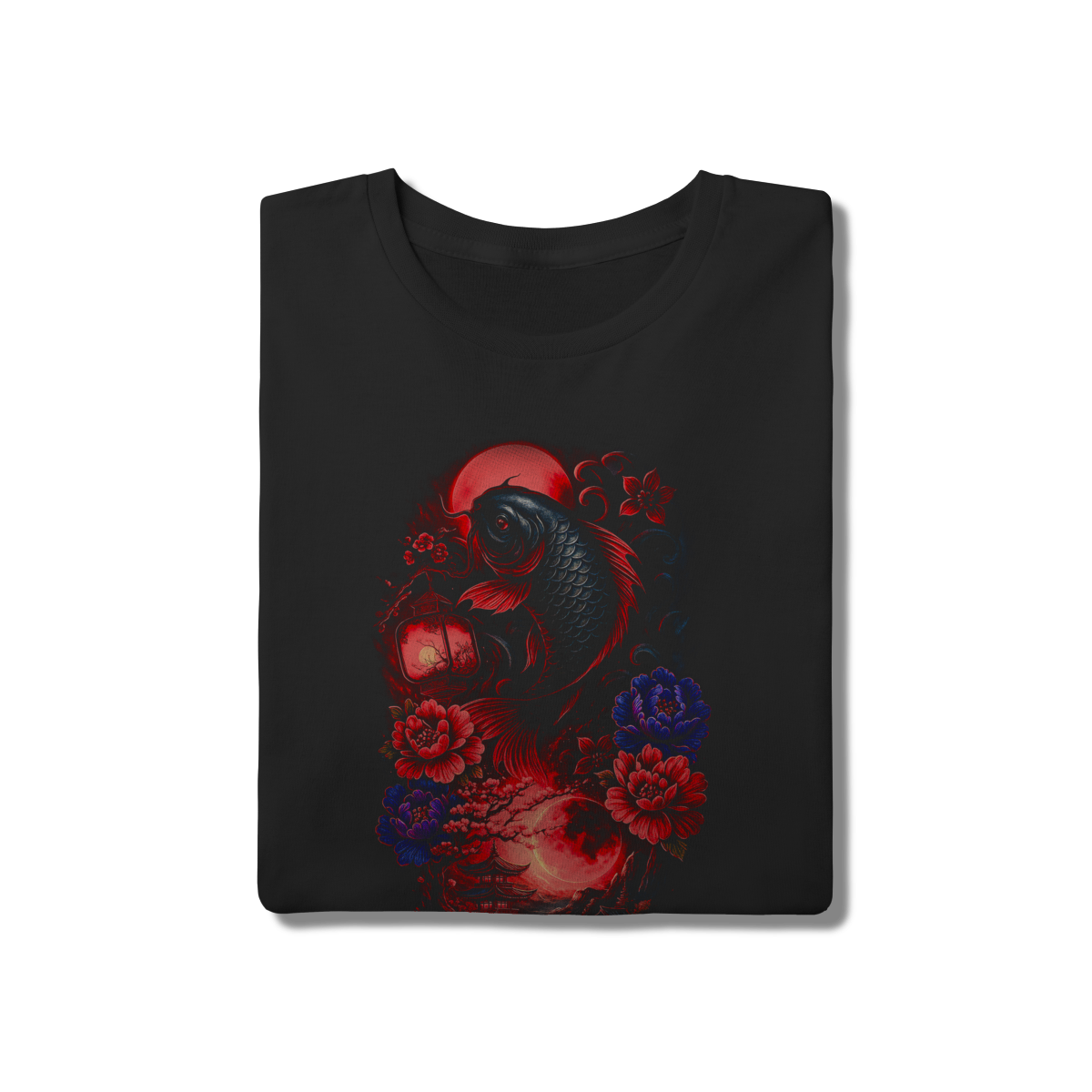 Uma jornada de perseverança sob a lua cheia. Esta estampa traz uma carpa Koi negra e vermelha saltando sobre uma paisagem clássica japonesa com pagodes e flores de lótus. Uma composição circular harmoniosa que evoca paz e determinação.