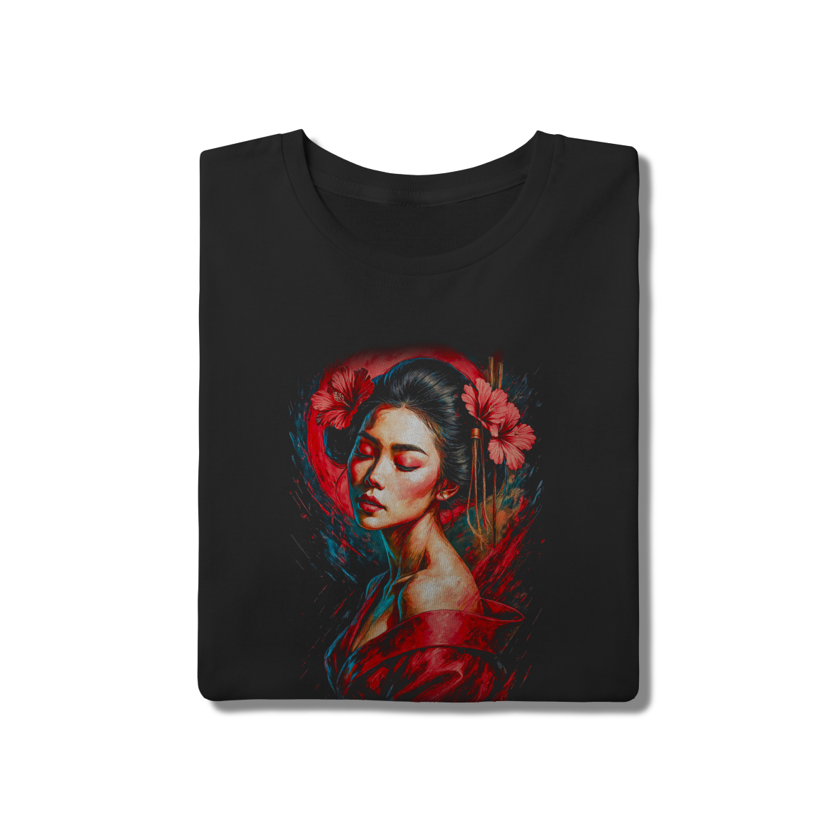 Serenidade e poder em uma composição de cores magnética. Esta peça destaca o perfil de uma gueixa adornada com flores de hibisco, mesclando tons de azul ciano e vermelho intenso. Uma estampa artística que foge do comum e garante destaque visual.