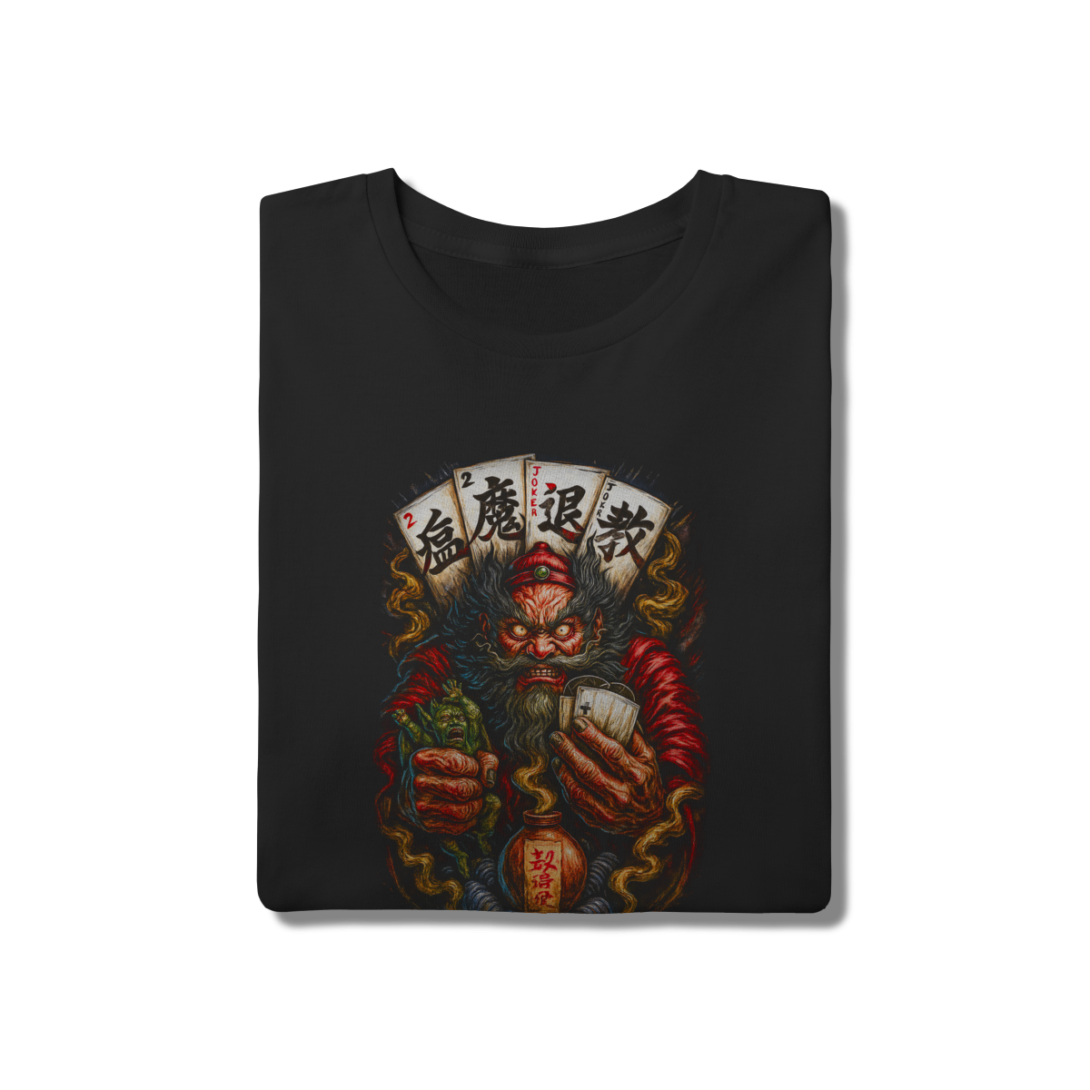 A batalha entre o sagrado e o profano. Esta arte complexa mostra um mestre exorcista dominando uma criatura Oni, cercado por cartas de talismã e fumaça espiritual. Uma peça de "Dark Art" densa e fascinante, perfeita para os amantes do ocultismo oriental.