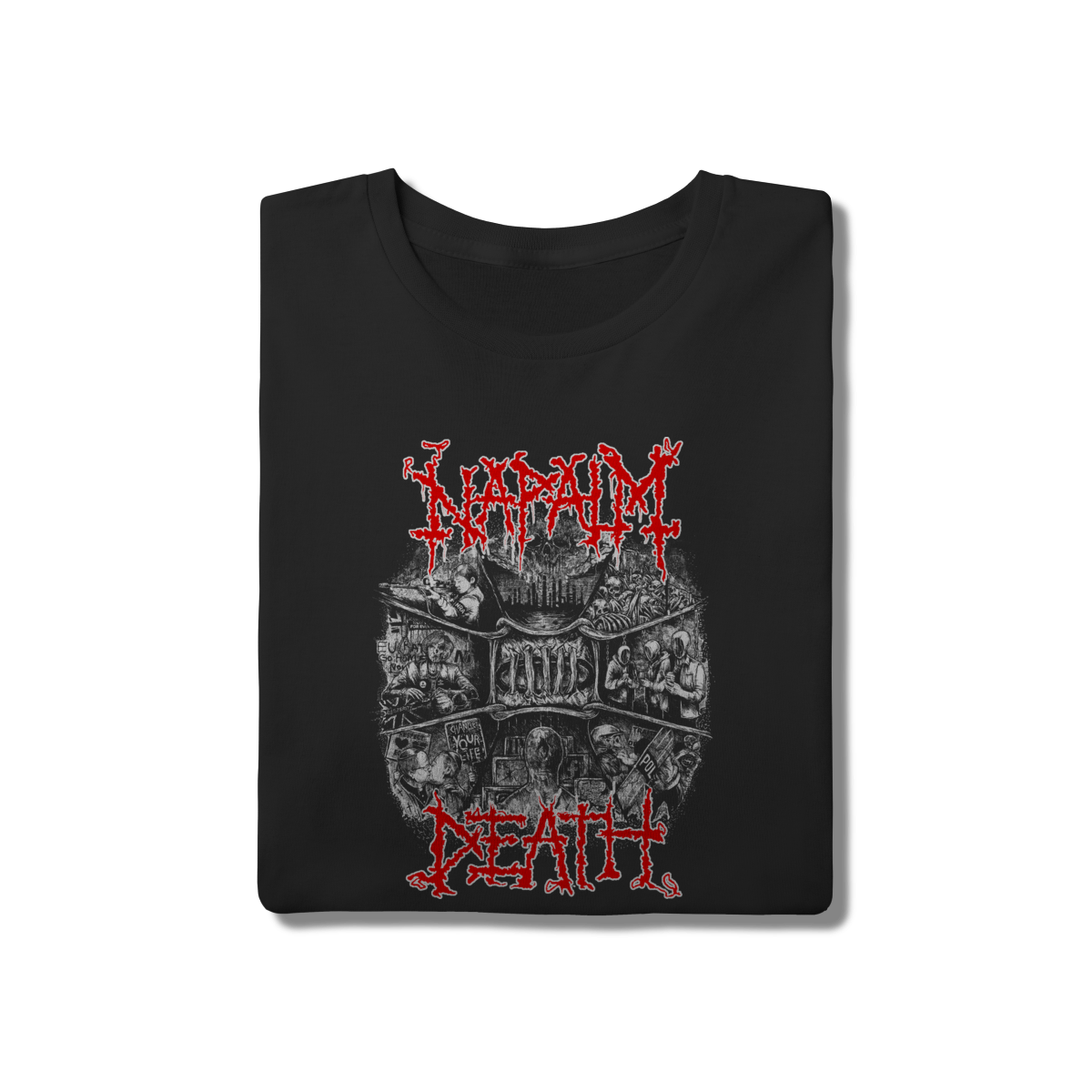 • Atitude extrema com a camiseta da banda pioneira do Grindcore, Napalm Death. A estampa detalhada em P&B com o logo em vermelho destaca o caos visual característico da banda. Fabricada em 100% algodão, esta camiseta preta é resistente e confortável, ideal para quem busca durabilidade em peças de bandas pesadas. Possui gola redonda clássica e caimento reto.
