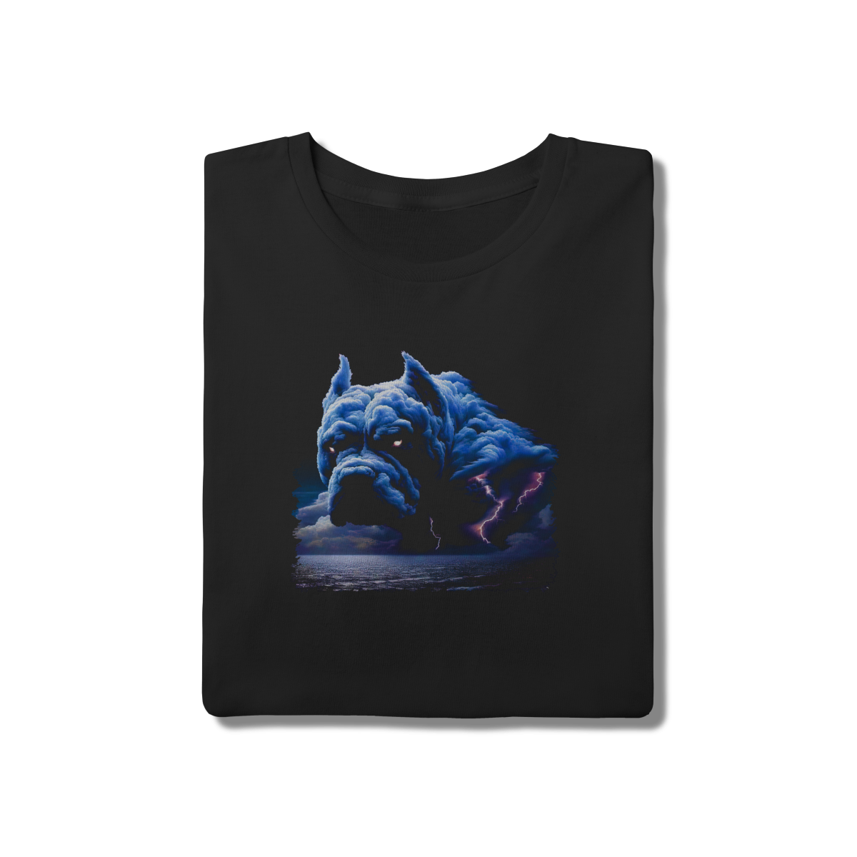 Potência pura em forma de camiseta. Este design surrealista mostra a silhueta de um cão robusto formada por nuvens de tempestade e raios cortando o oceano. Uma peça impactante para quem quer demonstrar força e resiliência através do que veste.