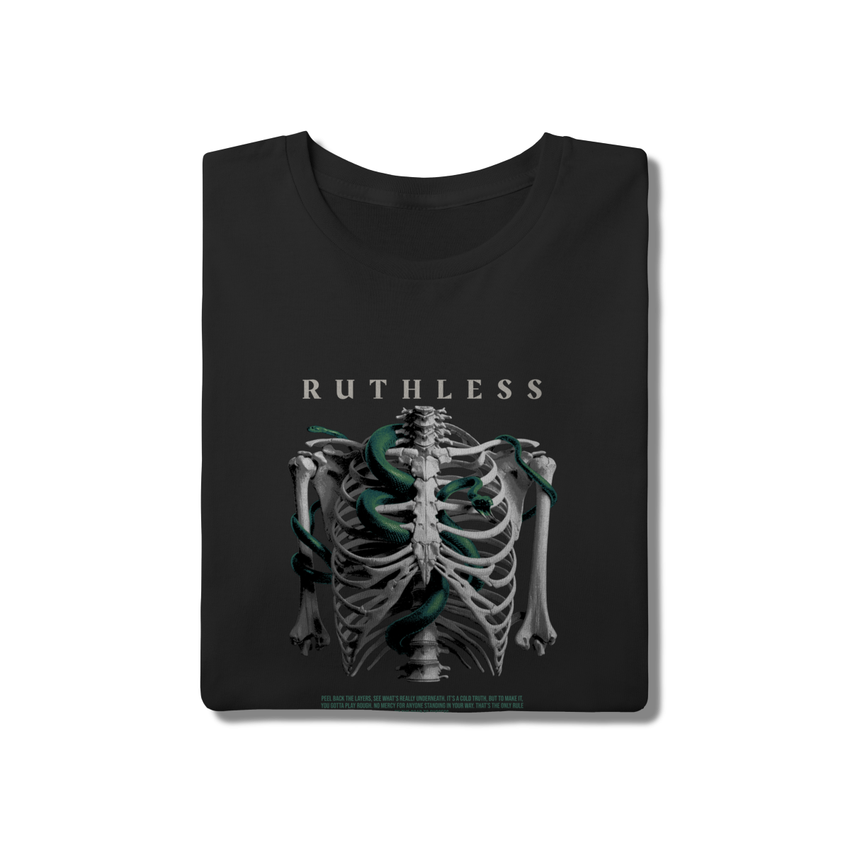 • Atitude e sofisticação em uma única estampa. A Camiseta "Ruthless" apresenta uma caixa torácica envolvida por uma serpente verde, simbolizando força e resiliência. O contraste do branco e verde sobre o preto profundo do algodão cria um visual marcante. Possui corte clássico tradicional, proporcionando conforto absoluto sem abrir mão do estilo gótico urbano.