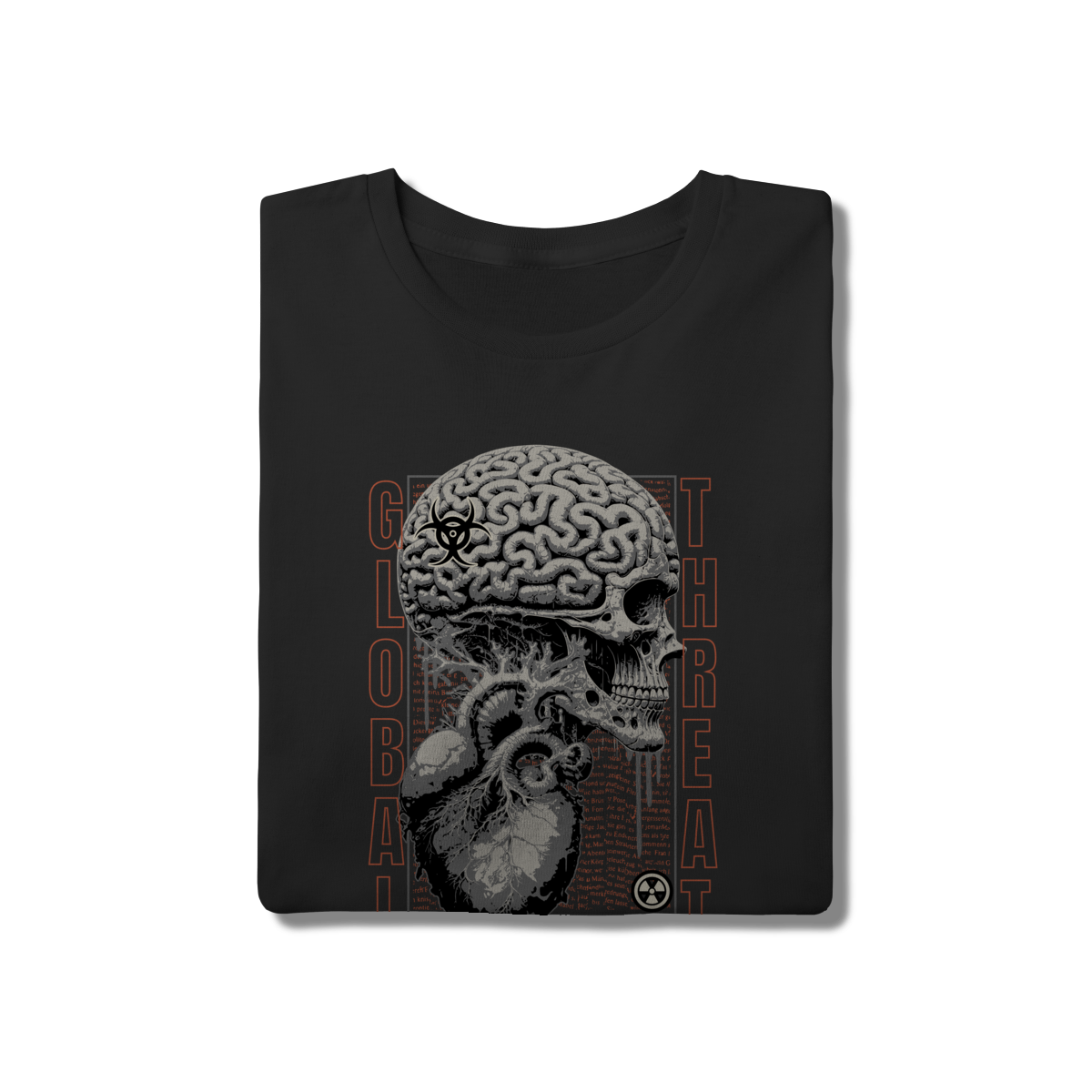 • Design de impacto para quem curte a estética Dark Industrial. A Camiseta "Global Threat" destaca uma ilustração detalhada de um crânio fundido a um coração e cérebro, com referências a mutações e substâncias perigosas. Produzida em algodão premium, une durabilidade e conforto clássico. Uma peça indispensável para compor looks underground e cheios de personalidade.