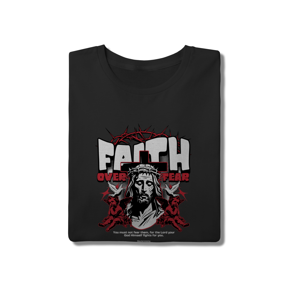 Expresse sua fé com atitude e conforto. Esta camiseta preta é confeccionada em malha 100% algodão com modelagem tradicional, garantindo um caimento impecável e durabilidade. A estampa "Faith Over Fear" traz uma arte urbana impactante de Jesus Cristo e anjos, unindo o estilo streetwear à mensagem bíblica de Deuteronômio 3:22. Ideal para quem busca um visual moderno com propósito.