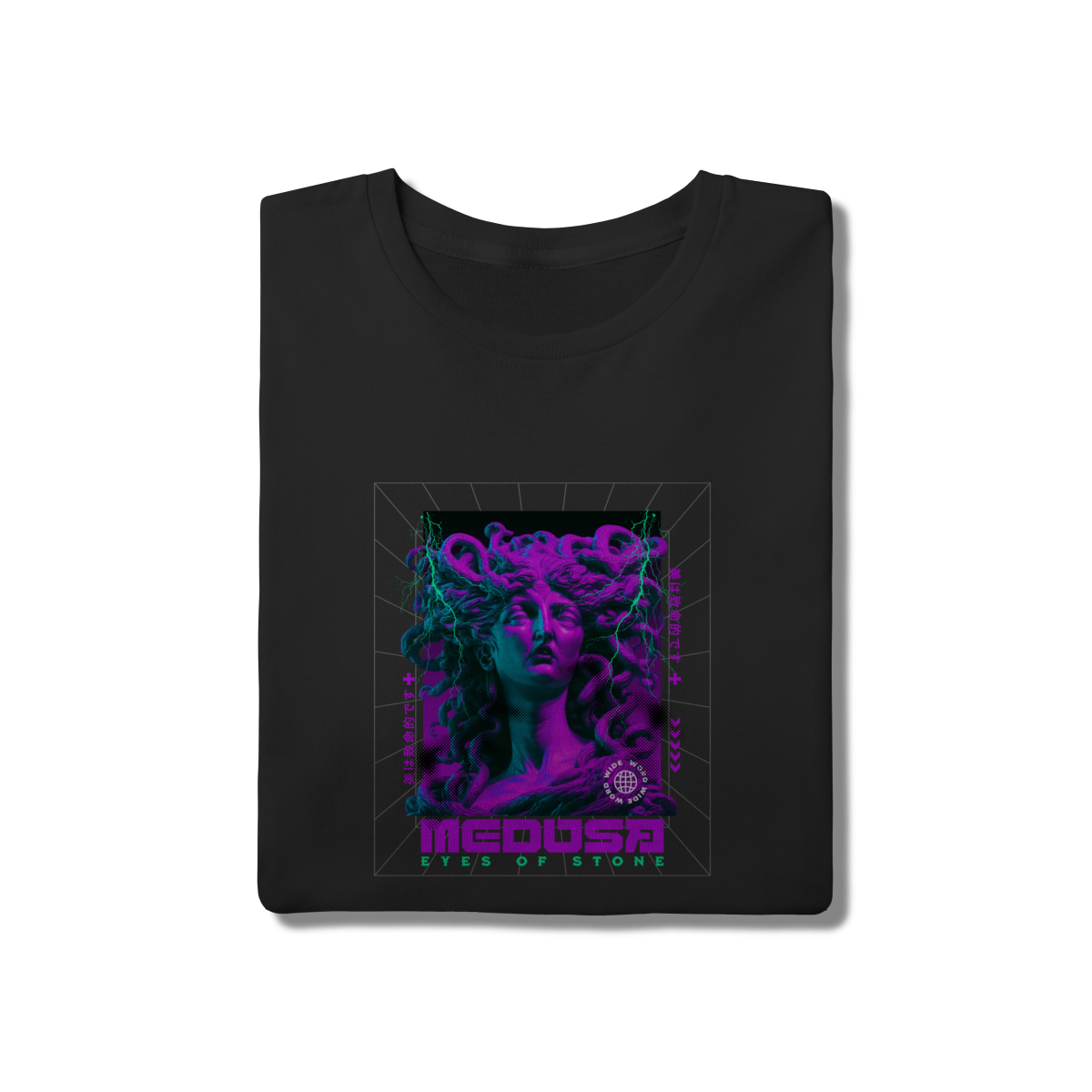 • Transforme seu estilo em pedra com a Camiseta Medusa "Eyes of Stone". Inspirada na mitologia grega com uma paleta de cores roxo e verde neon, esta peça traz uma pegada Vaporwave e tecnológica. Confeccionada em malha de algodão de alta qualidade, é confortável e estilosa para qualquer ocasião. Perfeita para quem busca uma peça de destaque com design artístico e cores vibrantes.