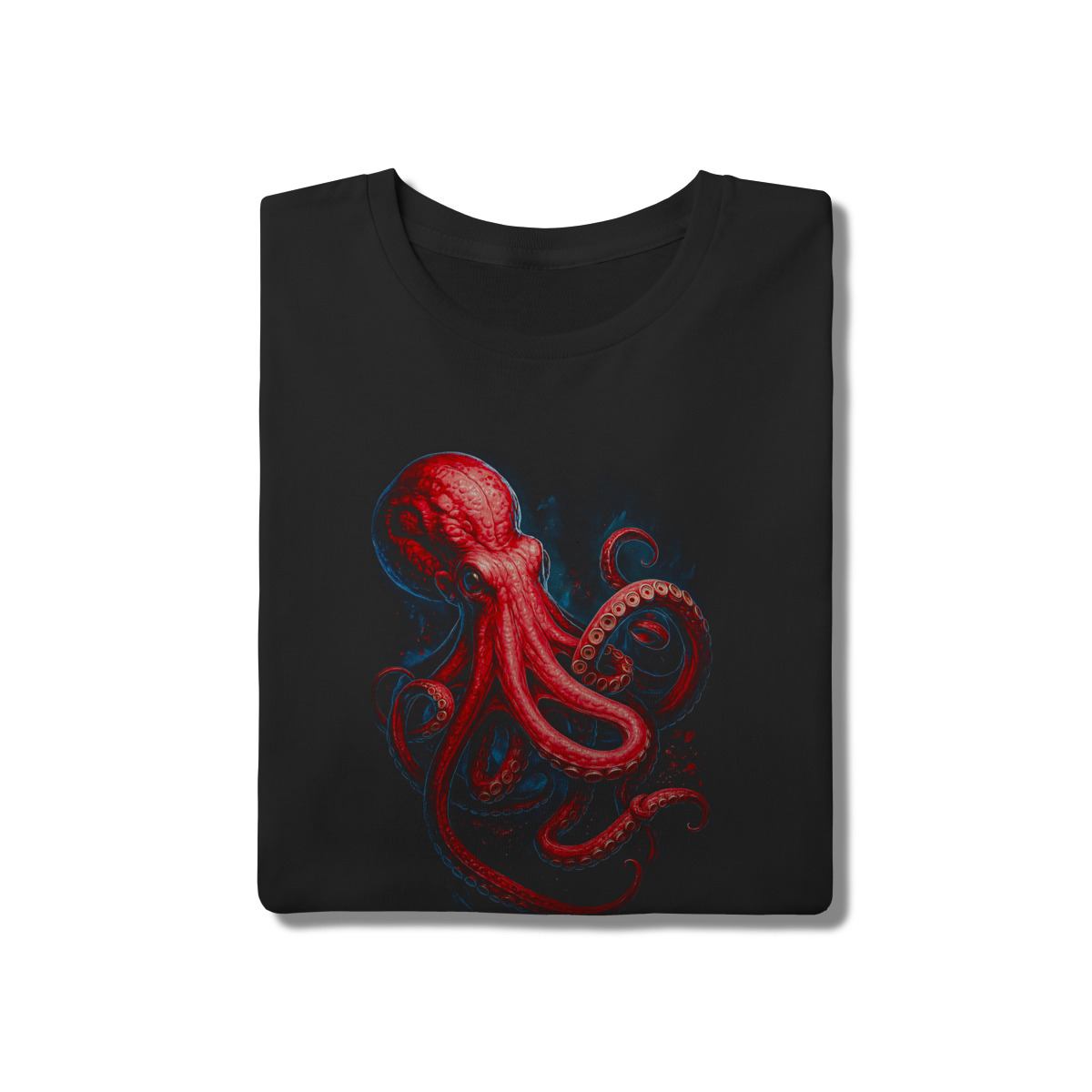 Para quem gosta de artes viscerais e detalhadas. Esta estampa destaca um polvo em tons de vermelho profundo com ventosas realistas, criando um contraste absurdo sobre o tecido escuro. Uma peça essencial para quem curte ilustrações náuticas com uma pegada moderna e agressiva. Conforto total em 100% algodão.