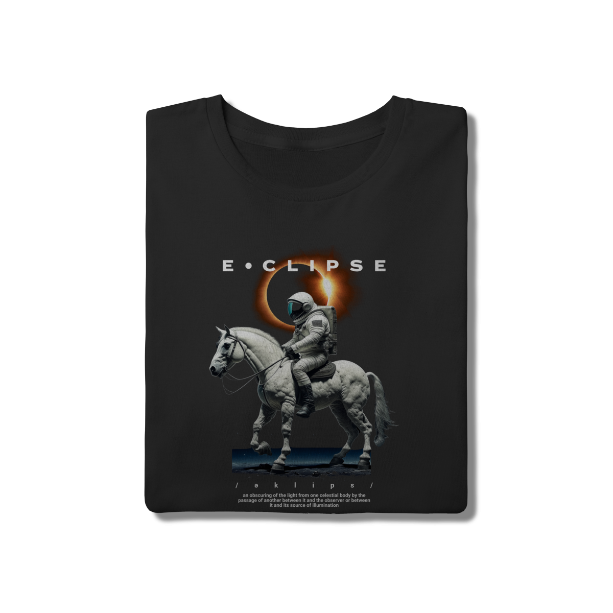 • Arte surrealista e design moderno definem a Camiseta "Eclipse". A imagem icônica de um astronauta montando um cavalo sob um eclipse lunar cria um visual único e instigante. Confeccionada em modelagem tradicional com malha 100% algodão, esta camiseta preta é a união perfeita entre conforto técnico e criatividade visual. Destaque-se com uma peça que foge do comum.