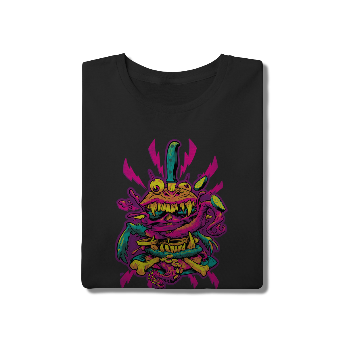 • Para quem curte um visual radical e divertido, a Camiseta "Monster Burger" é a pedida certa. A estampa traz um hambúrguer monstruoso em cores neon vibrantes (rosa, verde e amarelo), destacando-se intensamente no fundo preto. O algodão de alta qualidade e a modelagem tradicional asseguram o conforto necessário para o dia a dia. Adicione uma dose de humor e cor ao seu guarda-roupa com esta peça de design exclusivo.