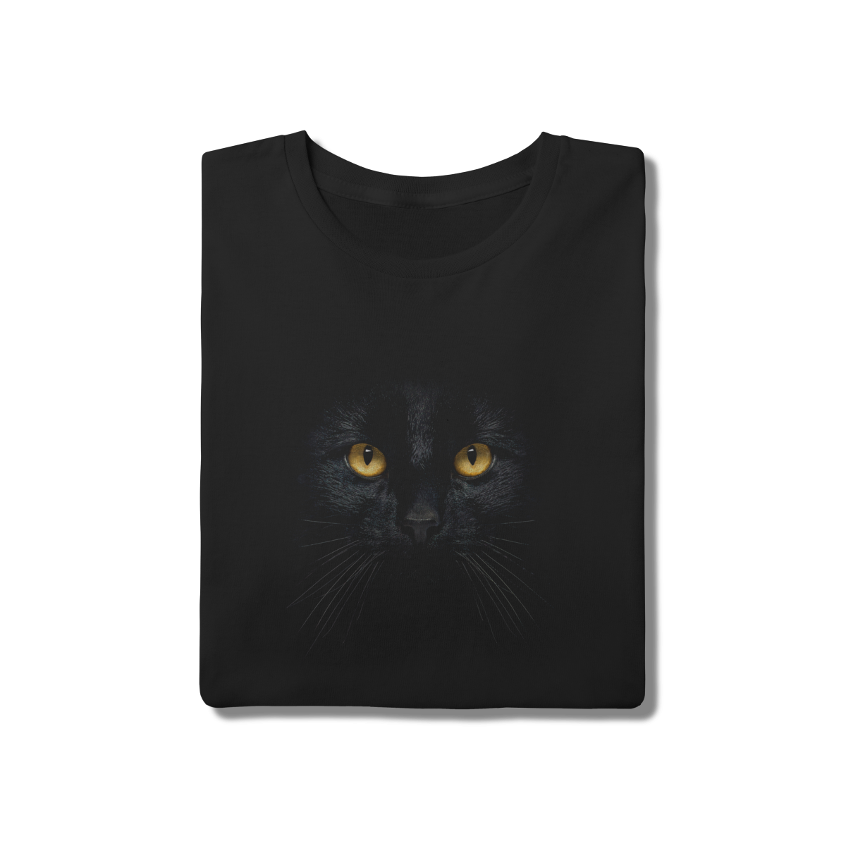 O mistério e a elegância do gato preto em uma estampa minimalista e impactante. O contraste dos olhos amarelos realistas sobre o fundo preto cria uma peça de destaque, ideal para qualquer ocasião. Uma escolha sofisticada para quem ama felinos e design limpo