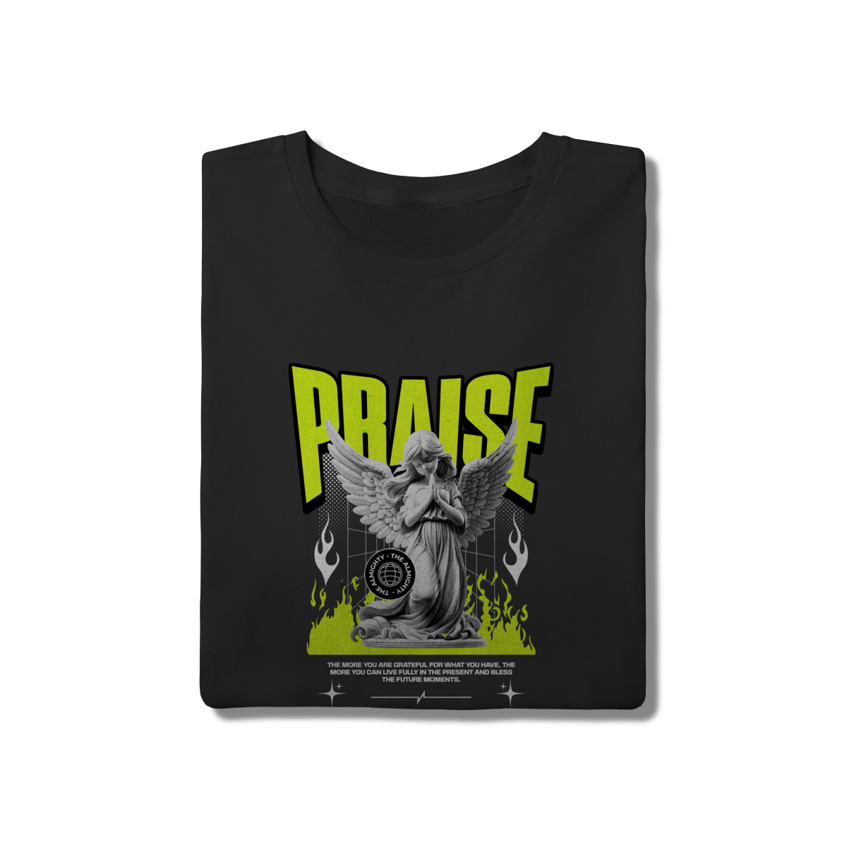 • Destaque-se com a Camiseta "Praise". A estampa em verde neon traz um design minimalista e moderno de um anjo em oração, simbolizando gratidão. Produzida em algodão de alta gramatura e modelagem tradicional, esta camiseta preta une o conforto essencial ao estilo impactante das ruas. Perfeita para compor looks casuais com um toque de luz e significado.