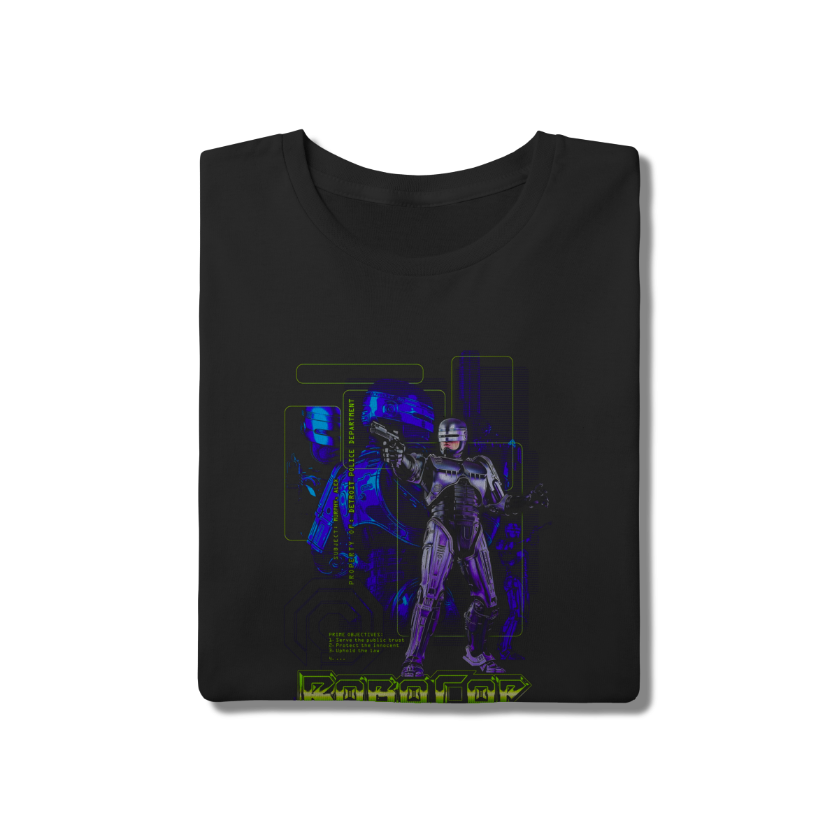 • "Vivo ou morto, você vem comigo!" A Camiseta RoboCop celebra o herói cibernético de Detroit. Com um design vibrante em tons de roxo e neon, a estampa destaca as diretrizes primárias do Policial do Futuro. Fabricada em algodão 100% com modelagem tradicional, é a peça perfeita para quem ama a estética cyberpunk e o cinema de ficção científica clássico.