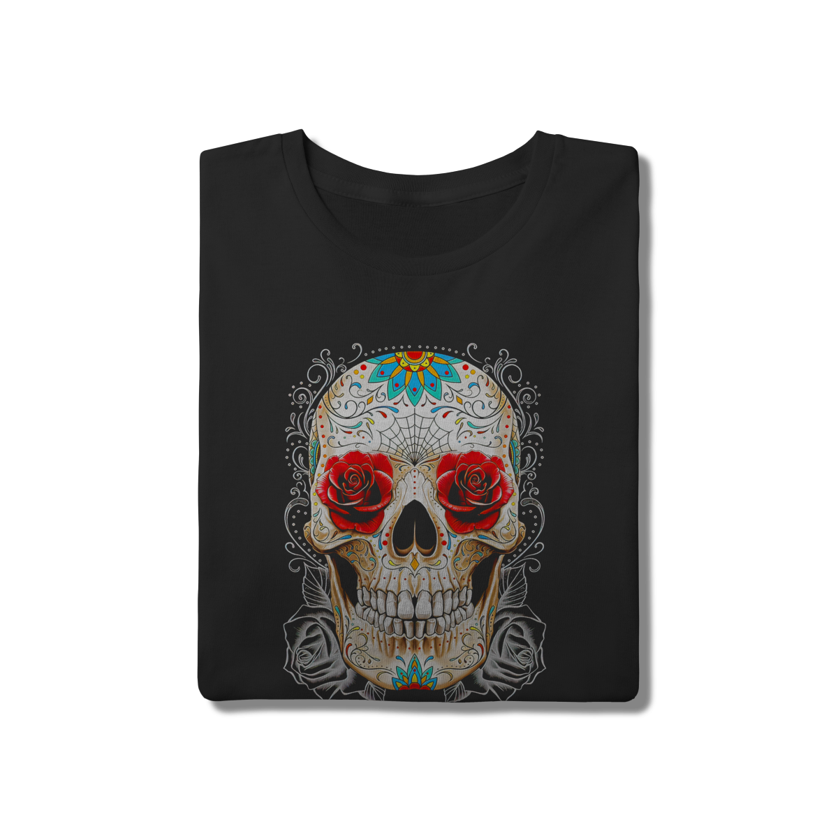 • Uma composição simétrica e elegante que une a caveira a elementos de teia de aranha e rosas intensas. O traço refinado e o uso inteligente das cores criam uma estampa limpa, mas cheia de detalhes para serem explorados. Ideal para quem aprecia o design gráfico e a arte simbólica. Conforto superior com malha 100% algodão e costuras reforçadas.