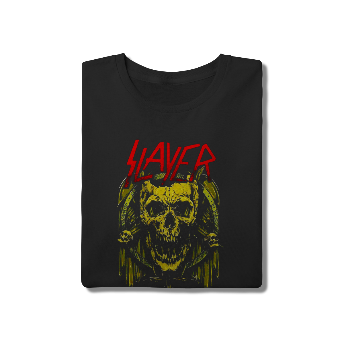 • Direto do Big Four do Thrash Metal! A camiseta Slayer traz a arte visceral do crânio com a águia, marca registrada da banda. Estampa com cores vibrantes sobre o tecido preto. Feita para aguentar o ritmo pesado de quem vive o metal.