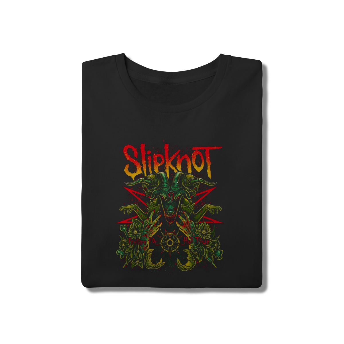 Entre no "Maggot Pit" com a camiseta Slipknot Prepare For Hell Tour. Arte detalhada com elementos ocultistas e o tradicional bode, representando a energia caótica da banda de Iowa. Modelagem reta tradicional que oferece liberdade de movimento.