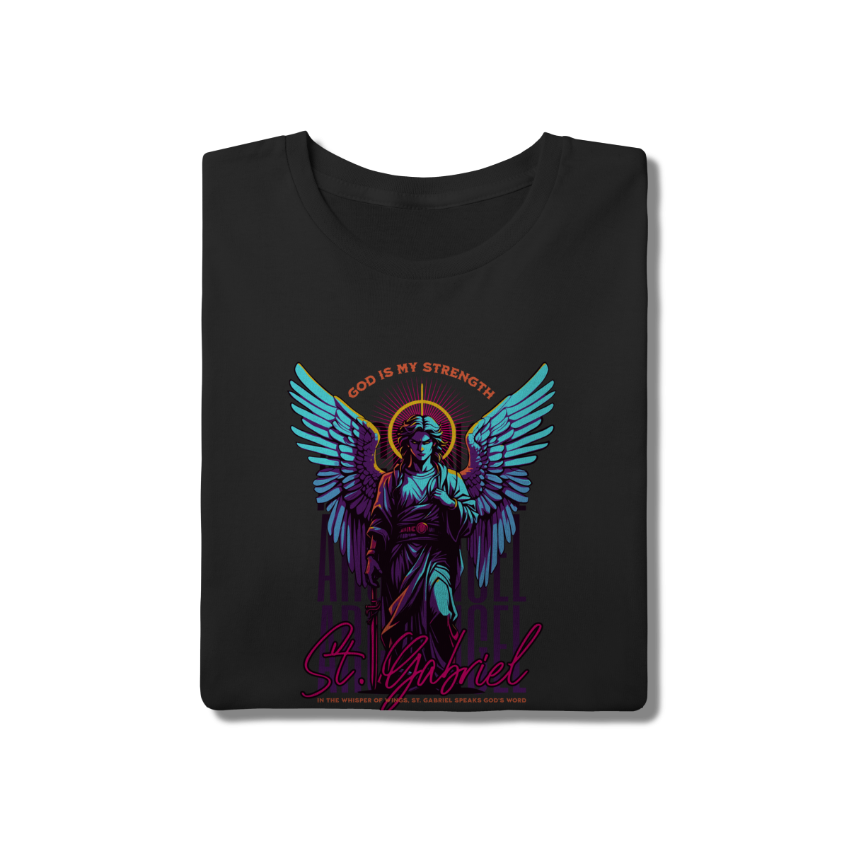 • Força e estilo em uma única peça. A Camiseta "St. Gabriel" apresenta uma ilustração poderosa do arcanjo em cores neon, destacando-se na malha preta de algodão. Com corte tradicional clássico, é uma peça versátil que transita entre o visual religioso e o urbano. Sinta o conforto da fibra natural com uma estampa que impõe respeito e personalidade.