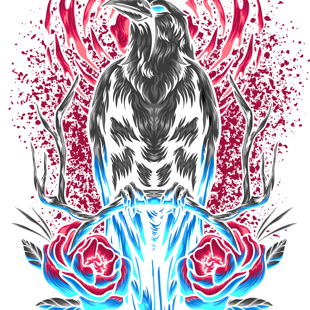 Misteriosa como a noite, intensa como a alma. Esta camiseta apresenta uma arte envolvente e simbólica de um corvo negro pousado em galhos secos, cercado por rosas vibrantes em um fundo escuro com salpicos de tinta. É uma peça que combina o misticismo com uma estética visual única e elegante.