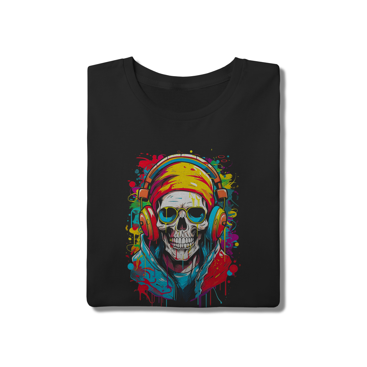 • A união perfeita entre música e atitude urbana. Esta camiseta traz uma caveira estilizada com fones de ouvido e óculos, cercada por respingos de tinta vibrantes (estilo grafite). Perfeita para amantes de música eletrônica, hip-hop e cultura streetwear. Modelagem clássica que garante caimento perfeito e durabilidade.
