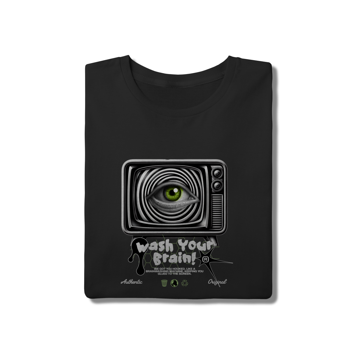 • Uma peça com conceito e voz. A Camiseta "Wash Your Brain" traz uma estética industrial e tecnológica, com estampa de TV retrô e olho hipnótico. Confeccionada em algodão de fibra natural, possui modelagem tradicional que não deforma após a lavagem. Ideal para quem curte a moda como forma de expressão e crítica social.